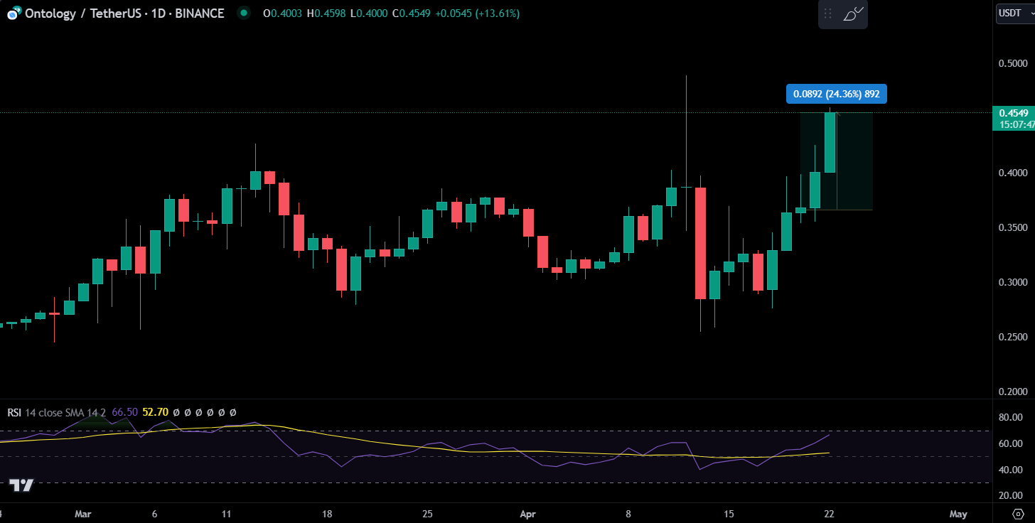 Während die Nachricht ein positiver Schritt nach vorne für das Projekt ist, hat Ontology (ONT) in den letzten 24 Stunden einen erheblichen Kursanstieg von 26 Prozent erlebt. Das Kursdiagramm veranschaulicht eine zinsbullische Tendenz mit einem Aufwärtstrend in den letzten Trading Sessions.