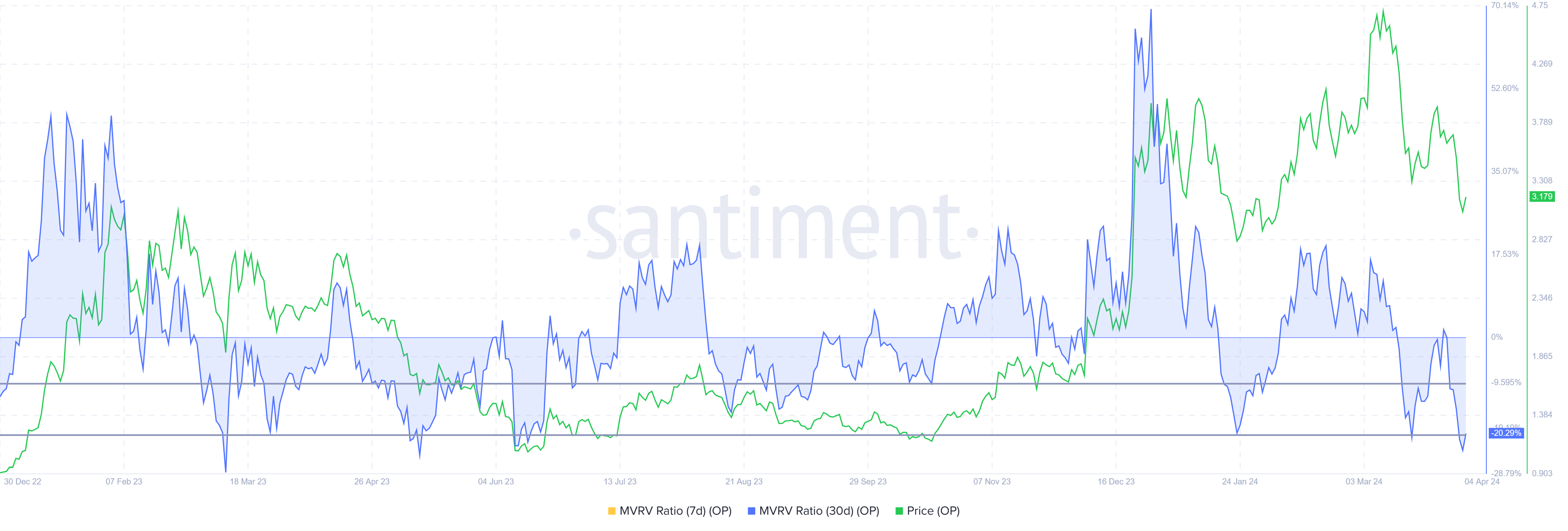 Dieser Indikator misst die Gewinne oder Verluste der Anleger und weist derzeit ein 30-Tage-MVRV von -20 Prozent für OP auf. Dies deutet auf die jüngsten Verluste hin, die zu einer Stagnation der Anleger führen könnten.