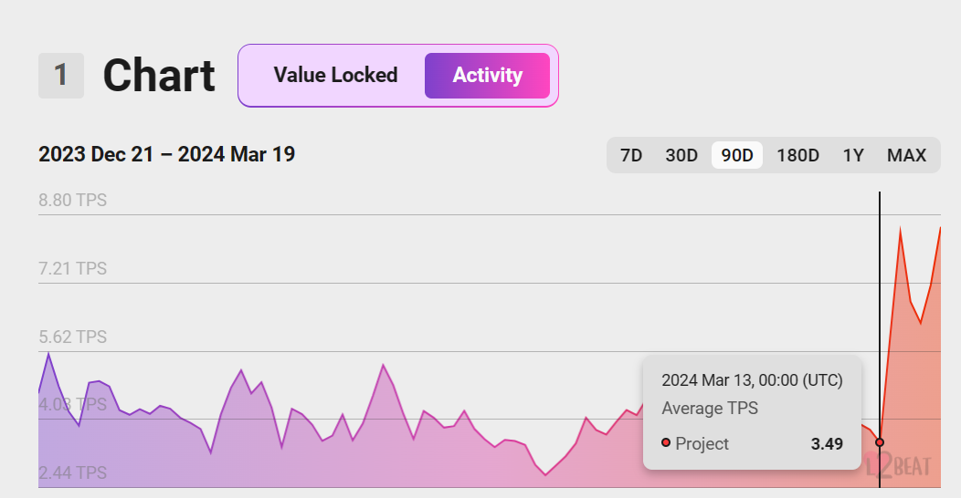 Der Einsatz des Testnetzes wurde positiv aufgenommen, was auch an der 15-prozentigen Erholung vom Tagestief am Dienstag zeigt. Darüber hinaus verzeichnete Optimism auch einen Anstieg der durchschnittlichen Transaktionen pro Sekunde (TPS).