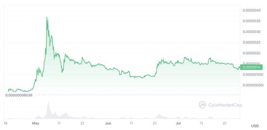 Meme-Coins sind schnelllebig und nach einem einmaligen Peak, der meist durch Euphorie im ersten Hype entstanden ist, ist es schwer bis kaum möglich, dieses Level nochmal zu erreichen, da die Coins ja auch ohne einen realen Nutzen kommen und Community-getrieben sind. PEPE liegt aktuell knapp 70 % unter seinem Hoch von Anfang Mai.