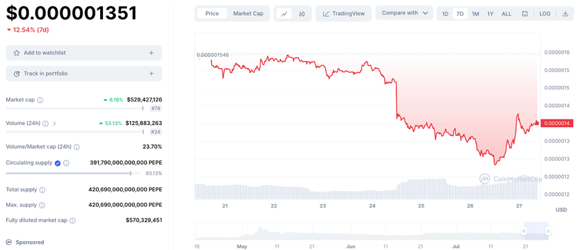 (7 Tage Kursentwicklung PEPE – Quelle: Coinmarketcap.com)
