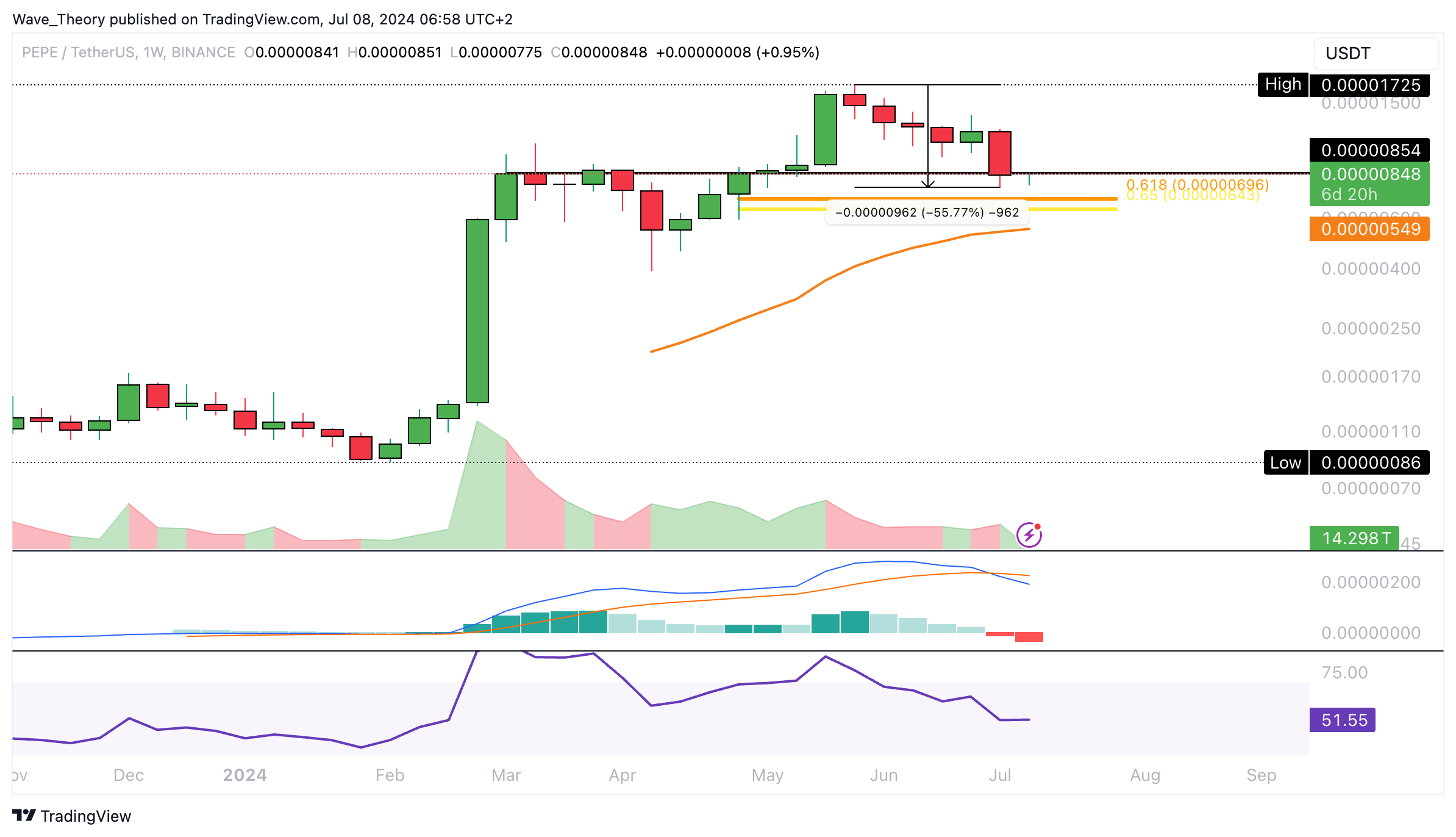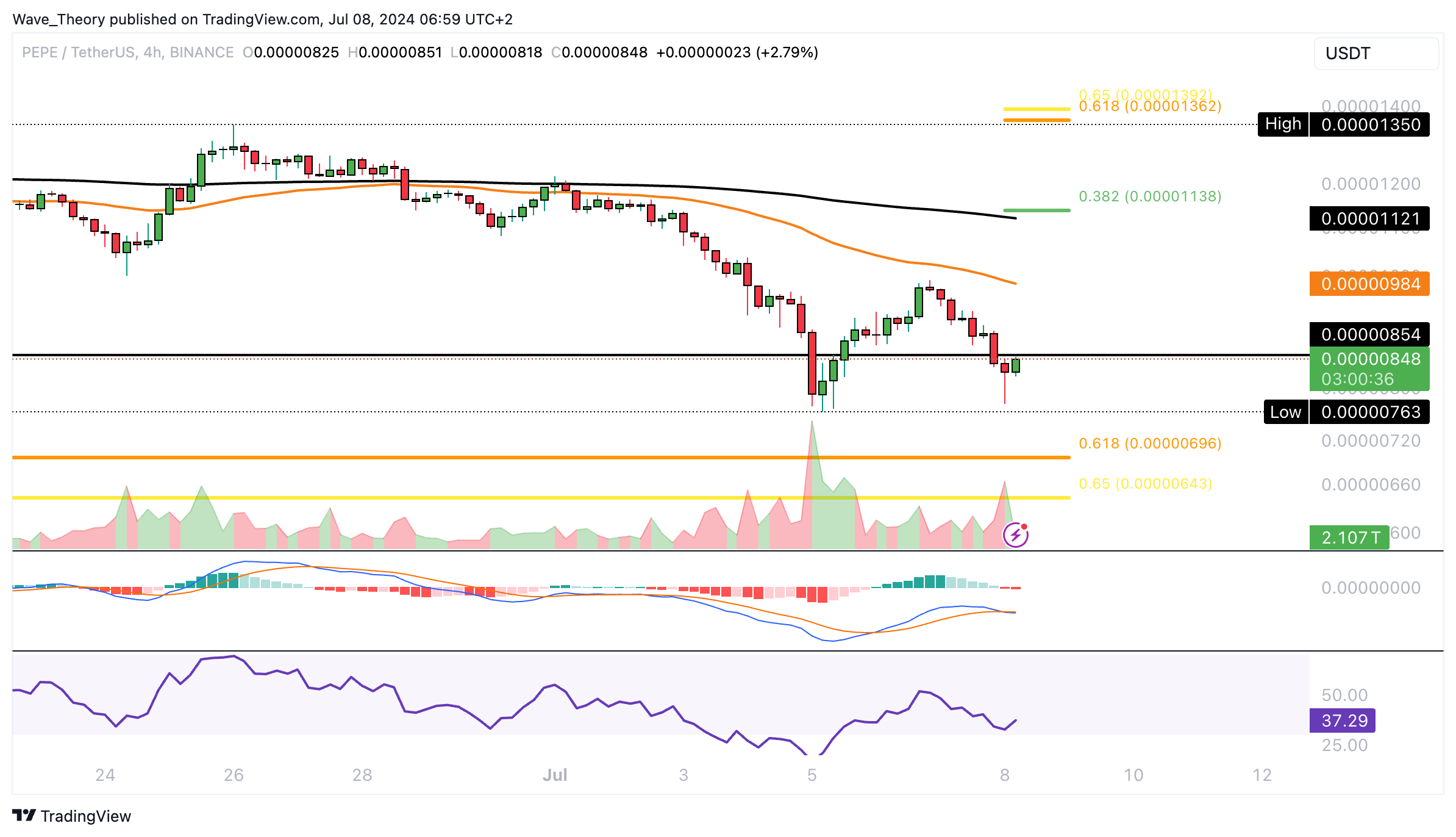 Seit dem lokalen Hochpunkt bei rund 0,00001725 USD ist der Pepe Kurs bisher um über 55 % gefallen. Derzeit stößt Pepe bei rund 0,00000854 USD auf signifikante Unterstützung.