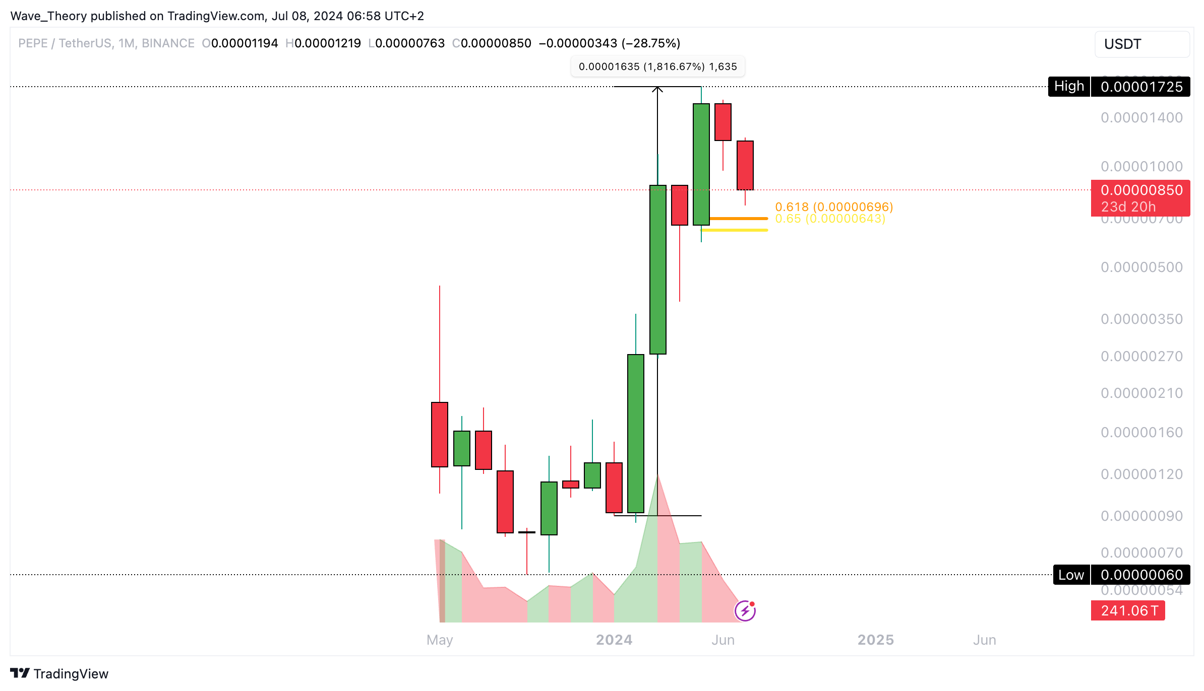 Doch seit letztem Monat befindet sich Pepe in einer starken Korrekturbewegung. PEPE stößt dabei bald bei rund 0,0000696 USD auf signifikante Fib Unterstützung.