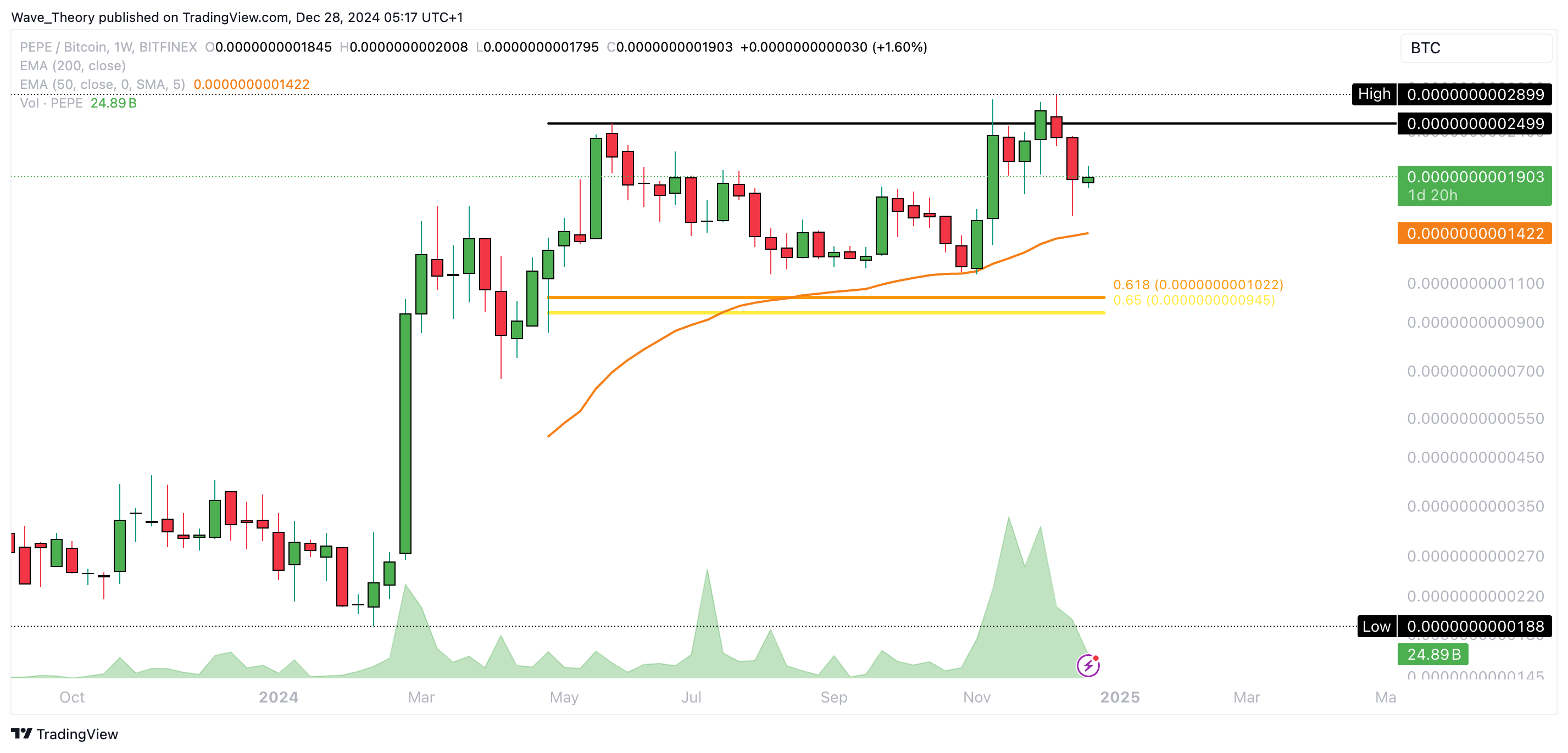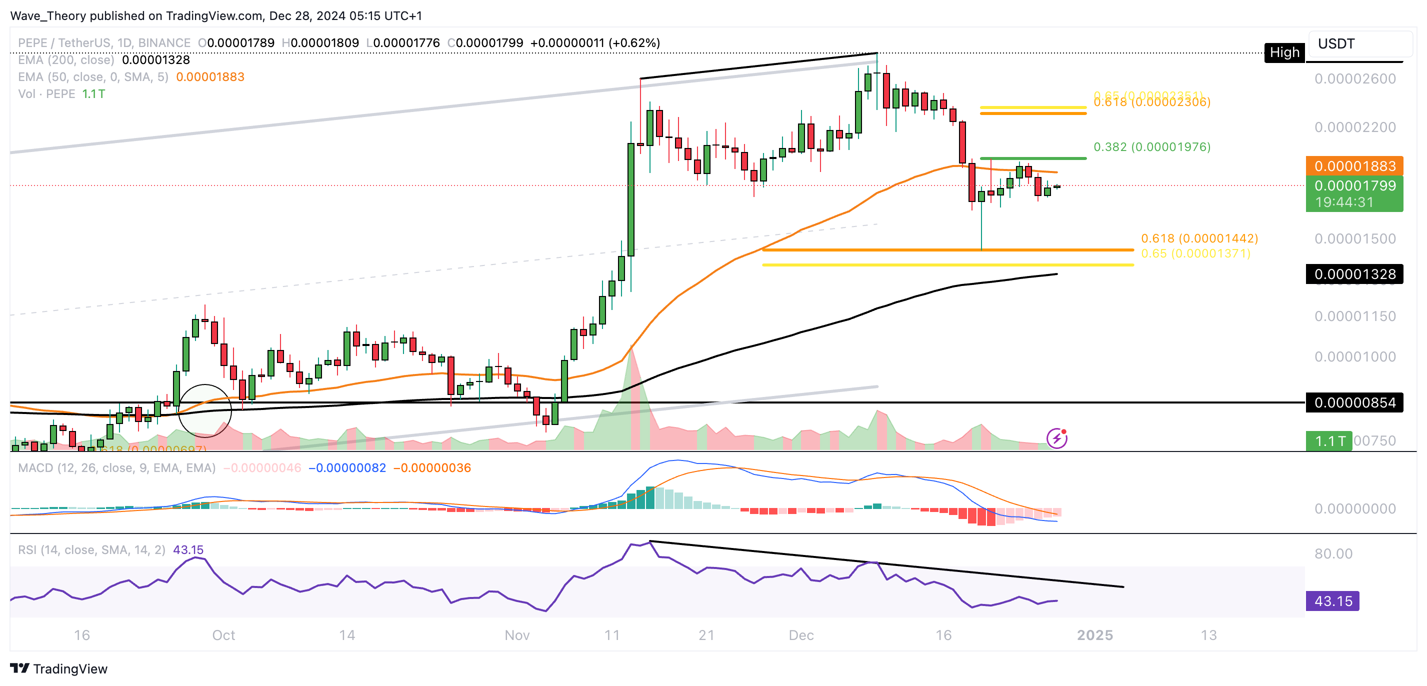 Sollte PEPE die Golden Ratio Unterstützung bei rund 0,00001442 USD bärisch brechen, wartet am 50-Wochen-EMA bei rund 0,0000108 USD die nächste signifikante Unterstützung.