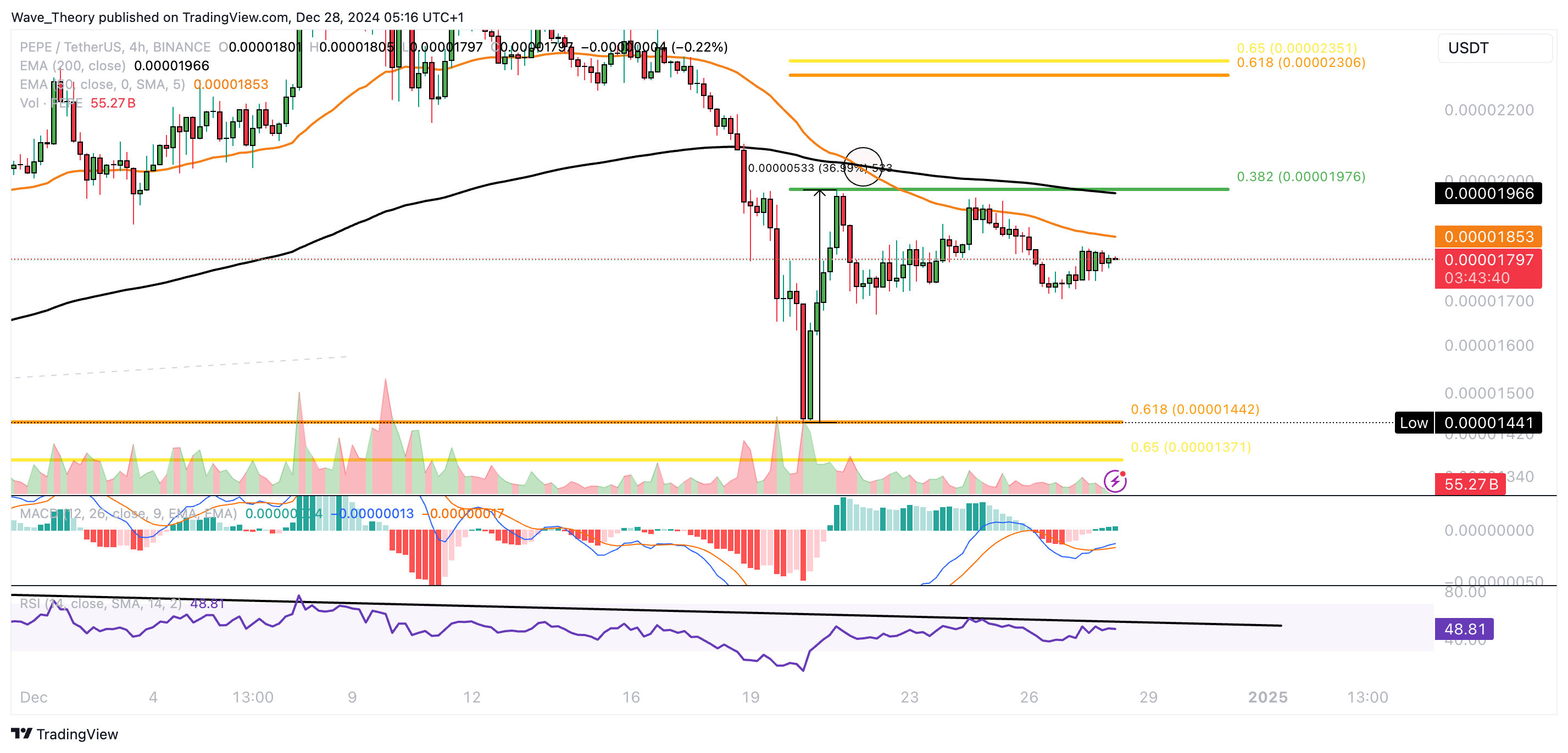 Des Weiteren gibt der RSI derzeit keine bärischen Signale. PEPE könnte kurzfristig erneut den Versuch unternehmen, den 0,382 Fib Widerstand bei rund 0,00001976 USD zu brechen.