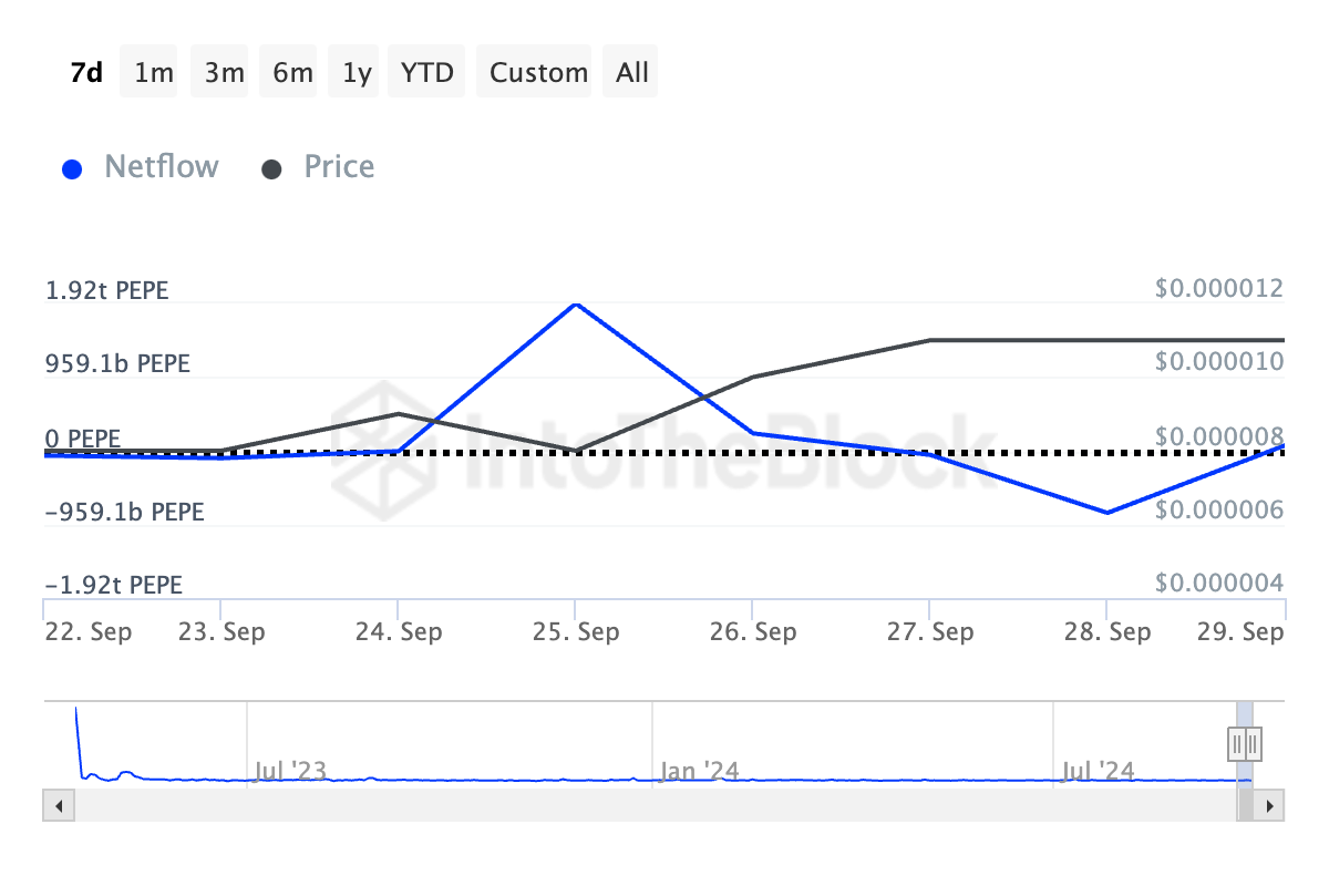 Die Aktivität der großen PEPE-Inhaber, die mehr als 0,1 Prozent des umlaufenden Angebots halten, könnte hier bemerkenswert sein. In der letzten Woche hat diese Gruppe von Inhabern ihre Coins schrittweise verkauft, was durch den Rückgang von 171 Prozent im Nettofluss der großen Inhaber belegt wird.