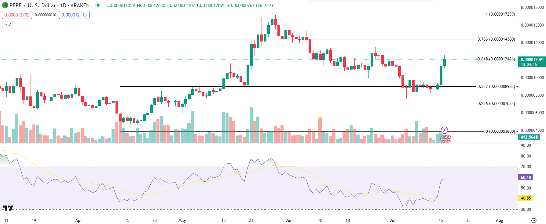 Das tägliche PEPE/USD-Diagramm zeigt, dass bullische Dynamik weiter zunimmt, wie der Relative Strength Index (RSI) anzeigt.