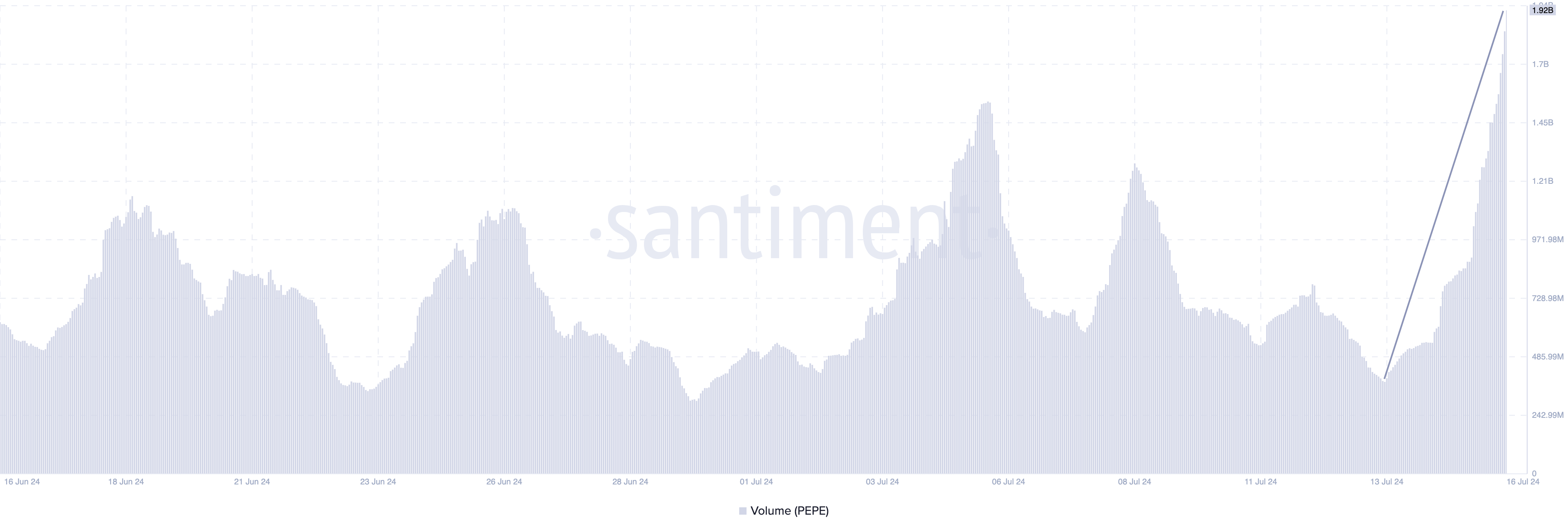 Diese Metrik beeinflusst auch den Kurs. Wenn beispielsweise der Kurs steigt und plötzlich das Volumen sinkt, deutet dies darauf hin, dass es Zeit für eine Umkehr sein könnte. Da das Volumen von PEPE jedoch weiter steigt, wird der Aufwärtstrend wahrscheinlich anhalten.