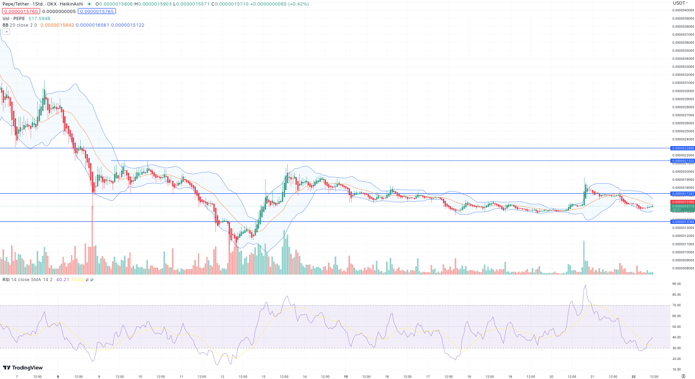 Nach Daten von CoinMarketCap verliert der Pepe Coin (PEPE) in den letzten 24 Stunden rund 8 % seines Werts. In einem hochvolatilen Handel ändert sich die Performance kontinuierlich. Dennoch kommt man nicht um die Feststellung, dass zum Wochenstart die bearischen Tendenzen bei PEPE überwiegen.