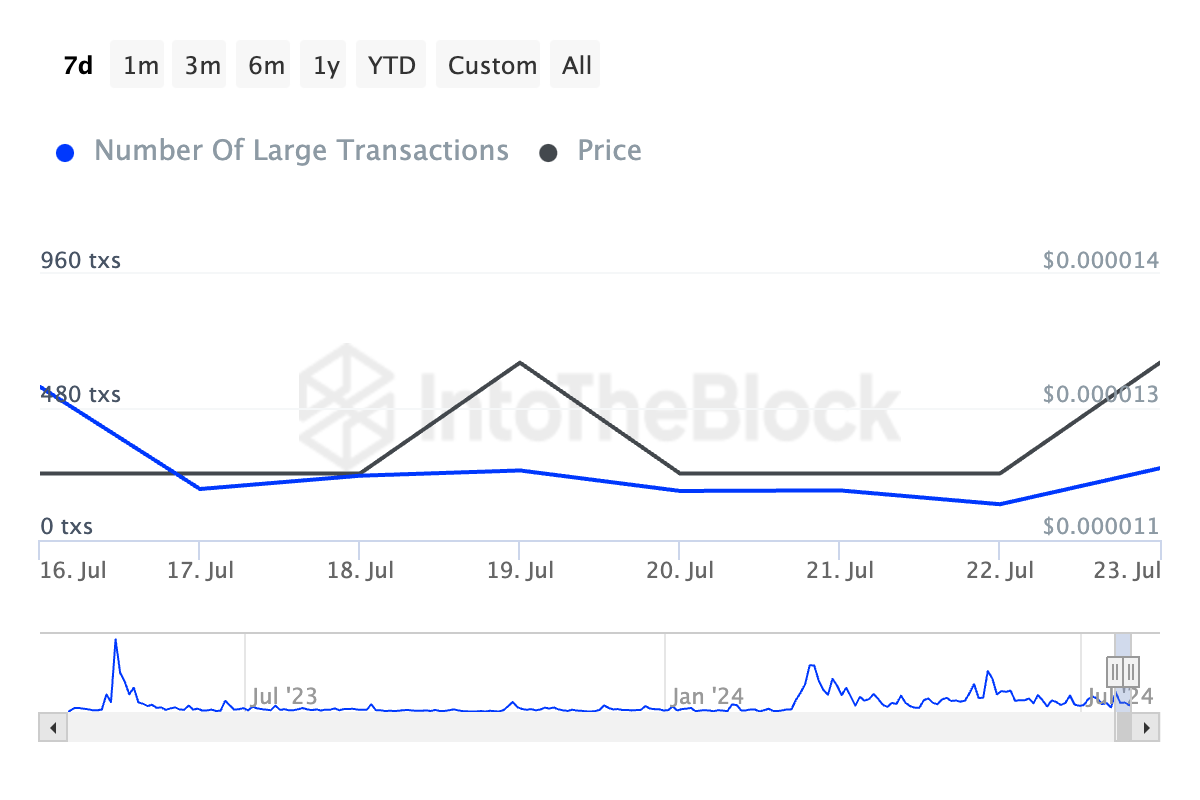 SponsoredGroße Transaktionen sind solche, bei denen der übertragene Betrag 100,000 USD übersteigt. Laut IntoTheBlock ist die tägliche Anzahl der PEPE-Transaktionen, die 100,000 USD überschritten haben, in den letzten sieben Tagen um 51 Prozent gesunken.