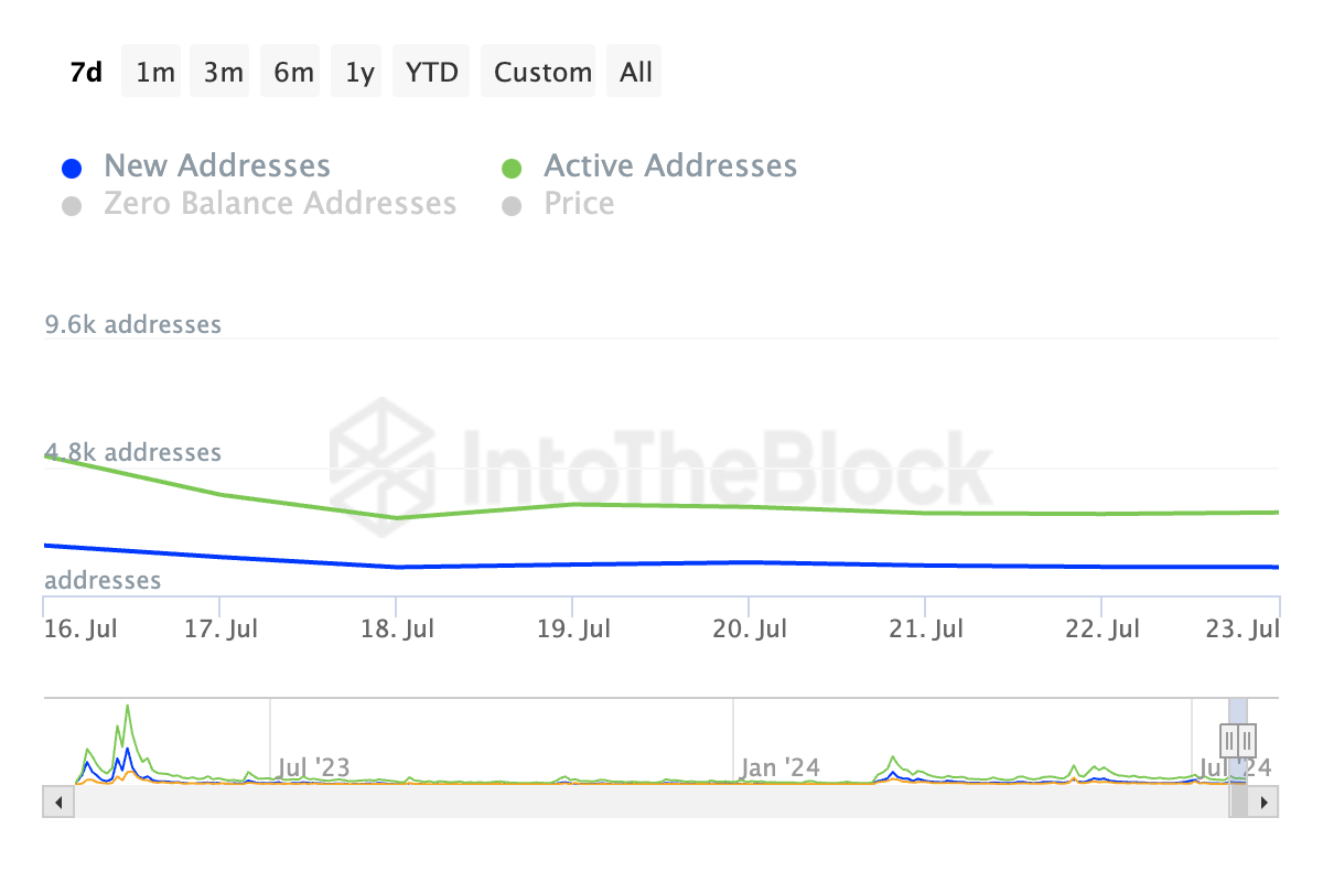 On-Chain gab es einen bemerkenswerten Rückgang der Nachfrage nach PEPE unter den Marktteilnehmern. Daten von IntoTheBlock zeigen einen Rückgang der täglich aktiven Adressen um 41 Prozent in den letzten sieben Tagen. Im gleichen Zeitraum sank die tägliche Anzahl neu erstellter Adressen, die den Memecoin handeln, um 43 Prozent.