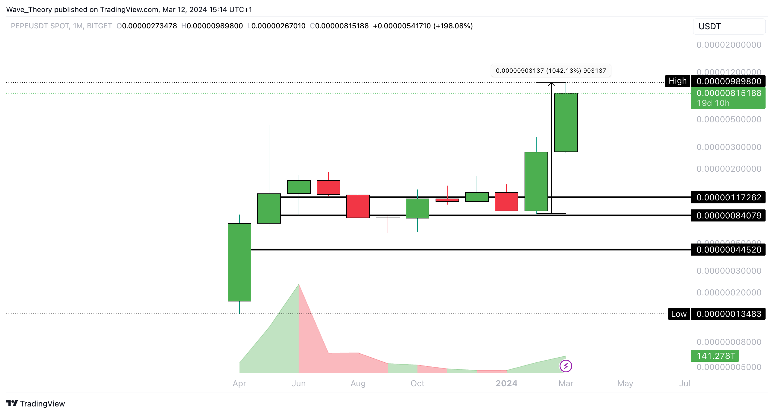 Der PEPE Kurs konnte seit Februar über 1.000 % im Kurs steigen – und damit mehr als eine Verzehnfachung im Kurs hinlegen. Das Handelsvolumen ist dabei seit 2024 auch ordentlich angestiegen – zeigt sich aber noch deutlich geringer als im letzten Jahr.