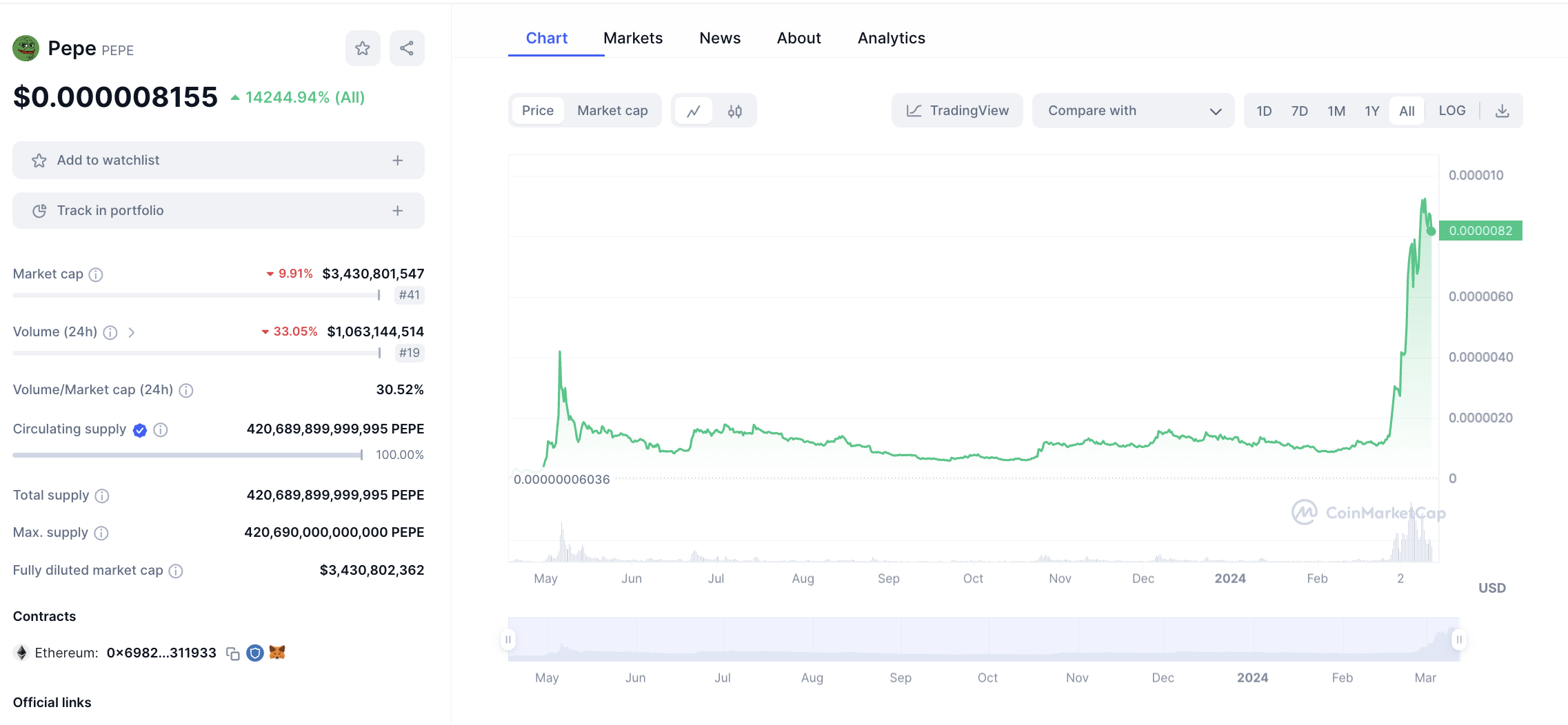 Der Memecoin PEPE sitzt derzeit auf einer Marktkapitalisierung von rund 3,4 Milliarden USD. Damit belegt er den 41. Platz im Marktkapitalisierungsranking der größten Kryptowährungen auf Coinmarketcap.