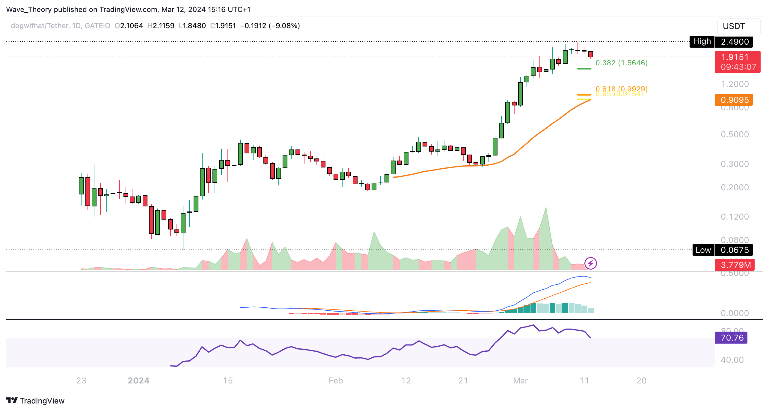 Die MACD Linien sind dabei noch bullisch überkreuzt. Wenn der WIF Kurs jetzt korrigiert, warten bei rund 1,56 USD und bei rund 1 USD die nächten sigifikanten Fibonacci Unterstützungen.
