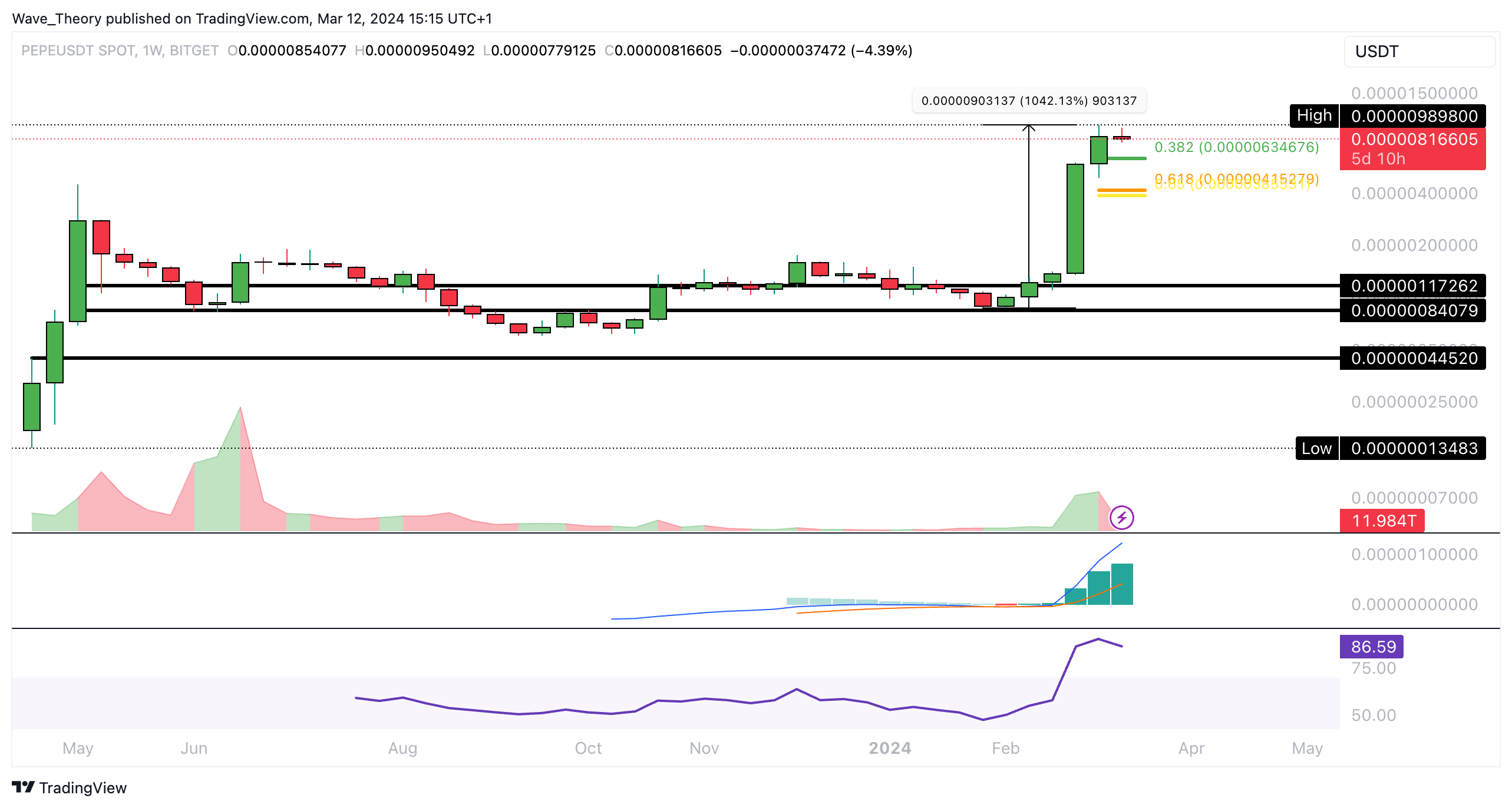Der PEPE Kurs könnte jetzt zu den nächsten Fibonacci Unterstützungen bei rund 0,000000634 USD respektive 0,0000004 USD korrigieren. Dort könnte der Kurs abprallen, um die Aufwärtsbewegung fortzusetzen.