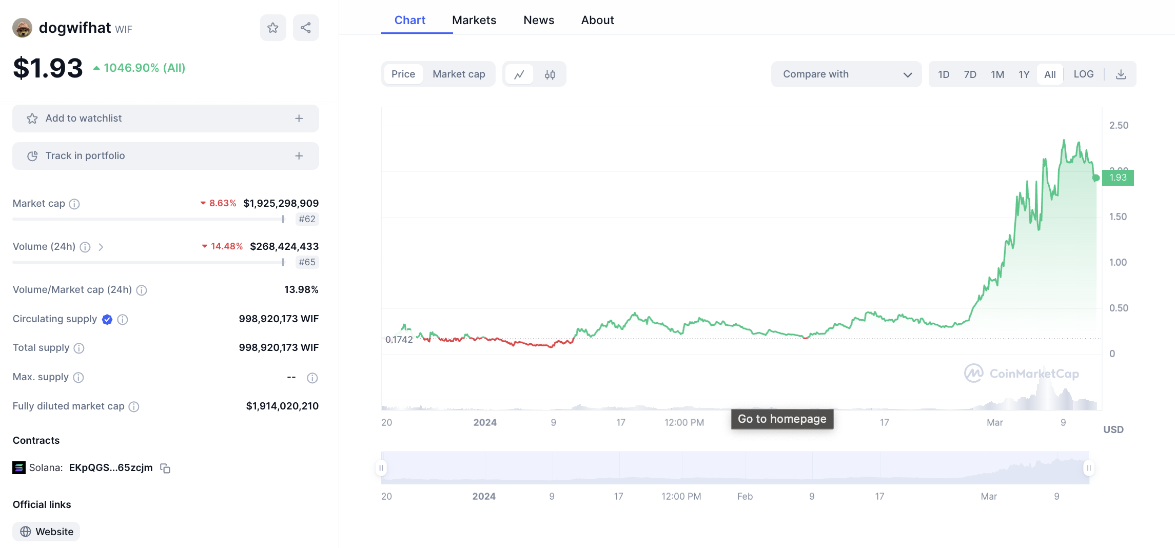 Der Memecoin WIF weist derzeit eine Marktkapitalisierung von rund 1,9 Milliarden USD auf. Dogwifhat ist damit auch knapp nur halb so groß wie PEPE.