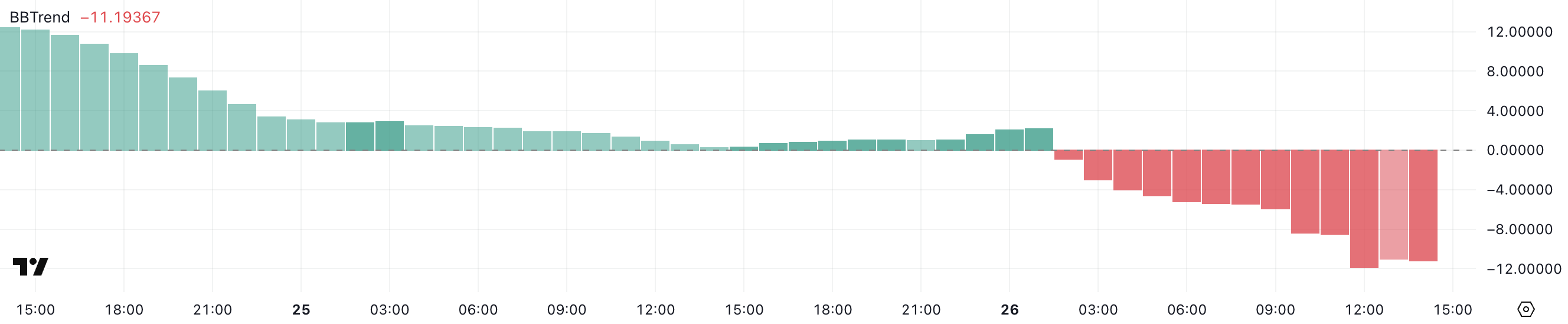 Trotz des anhaltenden Kursanstiegs ist der Bollinger Bands Trend Indikator (BBTrend) von Pi auf -11 gefallen, was einen dramatischen Rückgang von seinem Wert von 51,2 vor nur drei Tagen markiert, nachdem er gestern zwischen 1 und 3 geschwankt hatte.