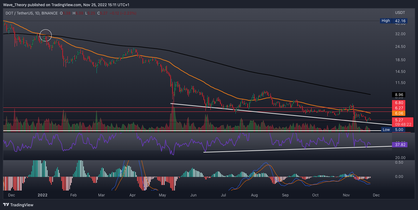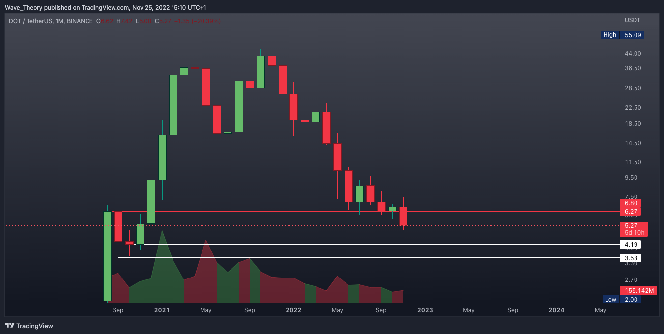 Der Polkadot Kurs hat die Unterstützungszone zwischen 6 USD und 6,8 USD bärisch gebrochen. Wird der DOT Preis auf rund 4 USD fallen?
