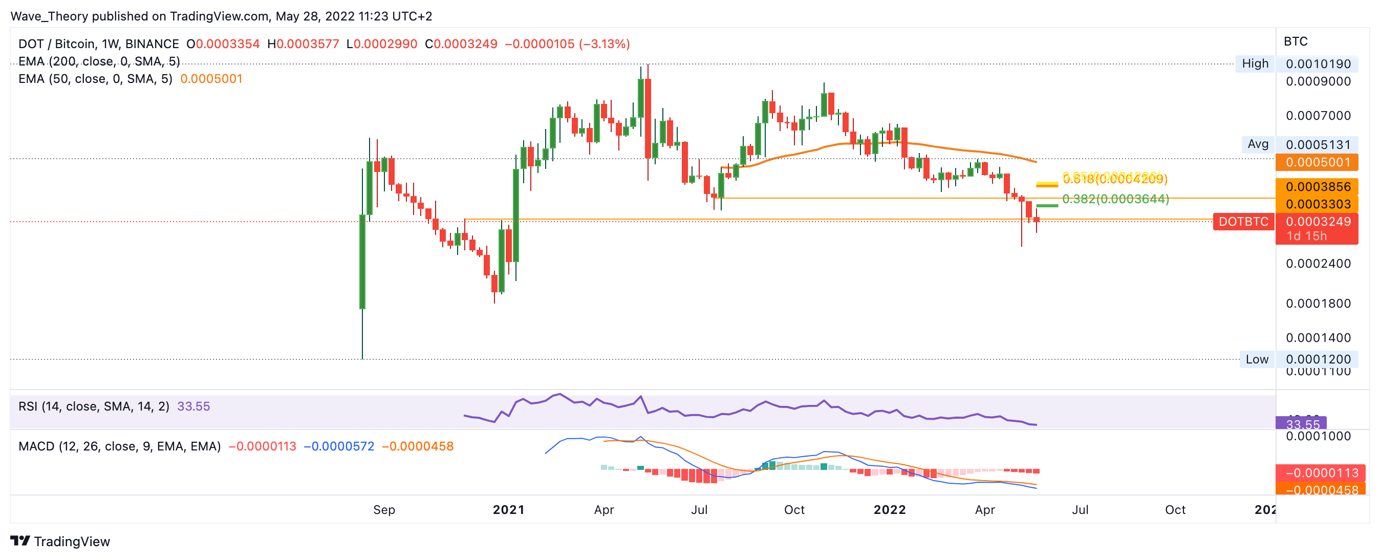 Gegen BTC befindet sich der DOT Kurs an horizontaler Unterstützung bei 0,00033 BTC. Aktuell hat Polkadot noch die Chance, erfolgreich an der Unterstützung abzuprallen, um die Fibonacci Widerstände bei 0,000365 BTC und 0,00042 BTC anzuvisieren. Zudem stößt Polkadot bei 0,0005 BTC auf den 50-Wochen-EMA Widerstand.