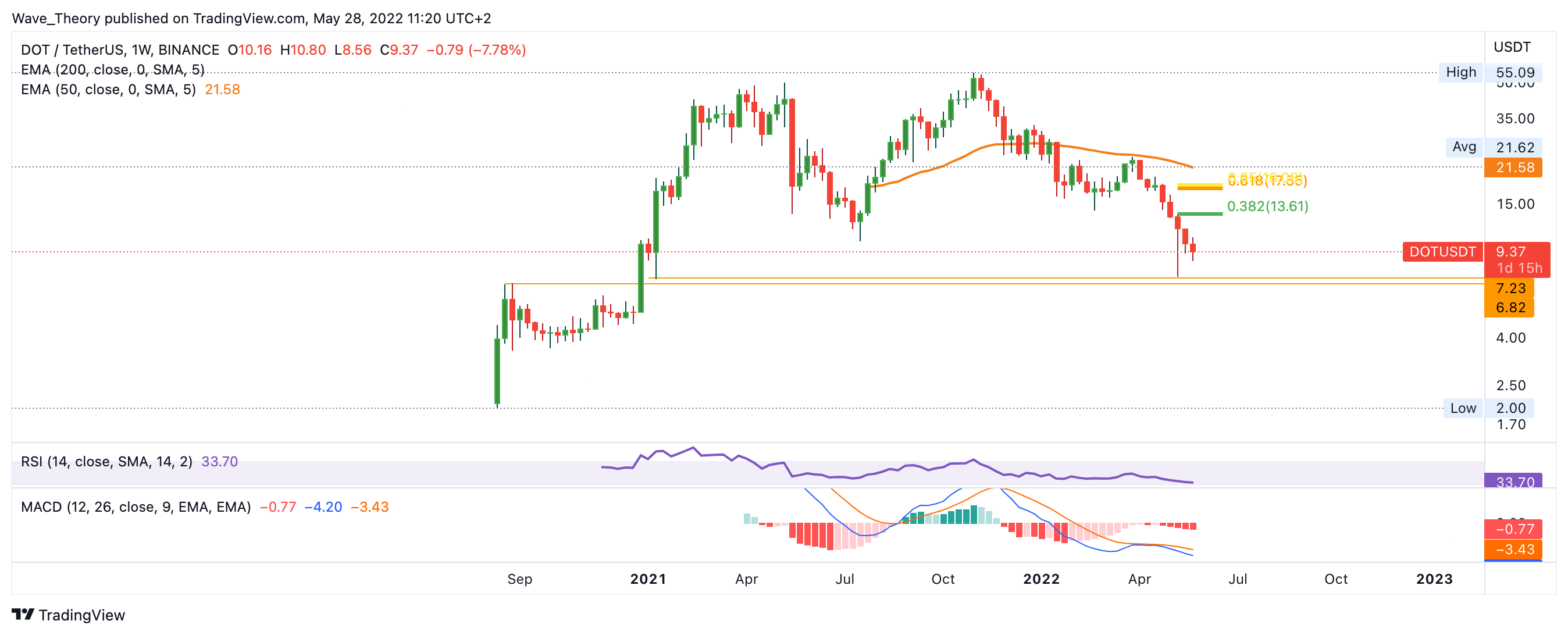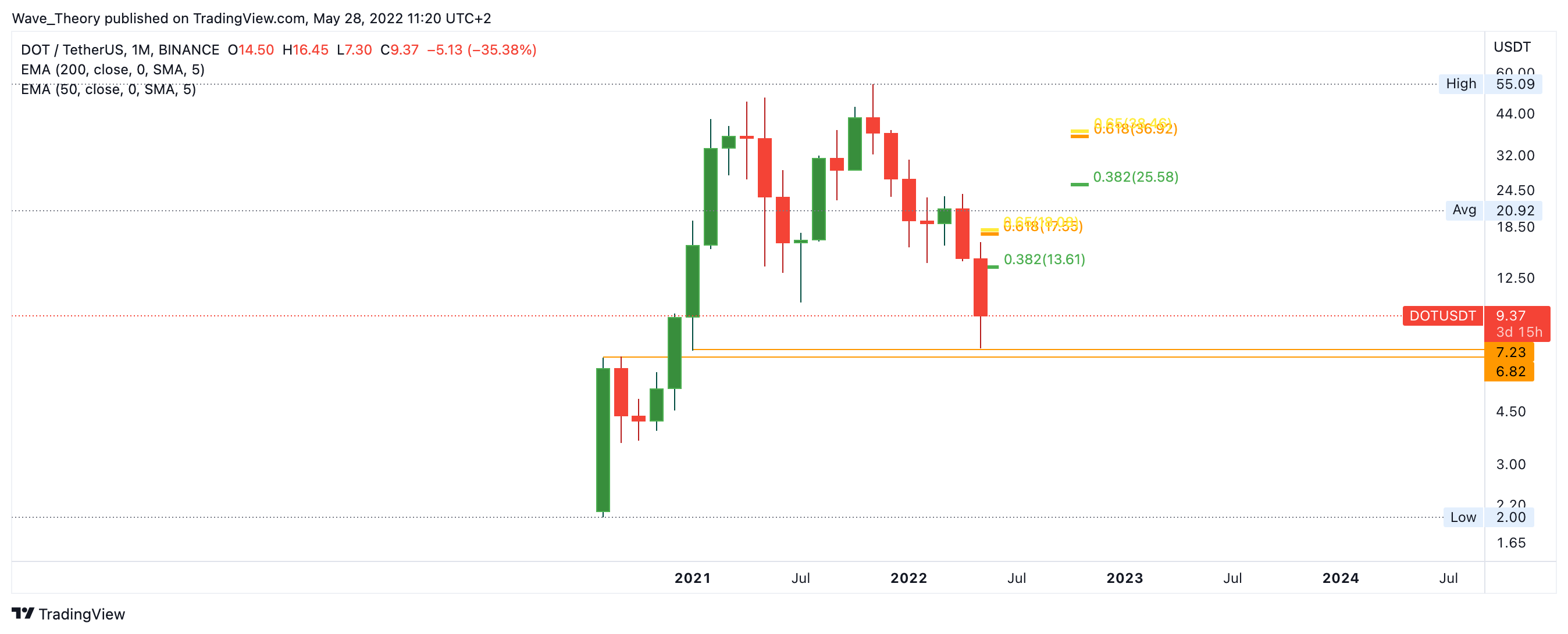 Damit der DOT Kurs wieder bullisch werden kann, muss er die Fibonacci Widerstände bei rund 26 USD und 38 USD brechen. Erst wenn Polkadot das Preisniveau von rund 38 USD nachhaltig bricht, ist der Trend von Polkadot wieder bullisch. Bis dahin, befindet sich Polkadot nach wie vor in einem Bärentrend.