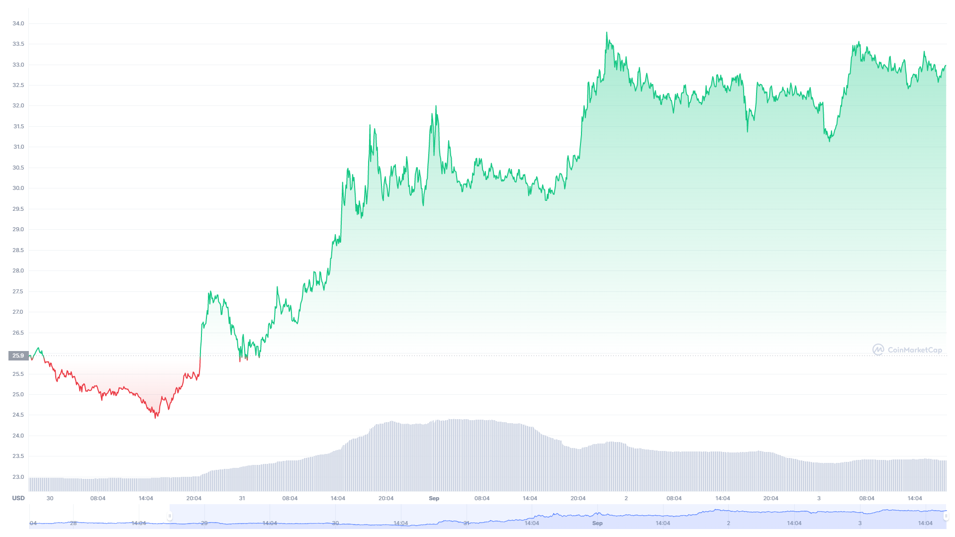 Der Polkadot Kurs (DOT) ist in dieser Woche um 50% angestiegen. Zum Zeitpunkt der Veröffentlichung befindet sich der DOT Preis bei ca. 33 USD.