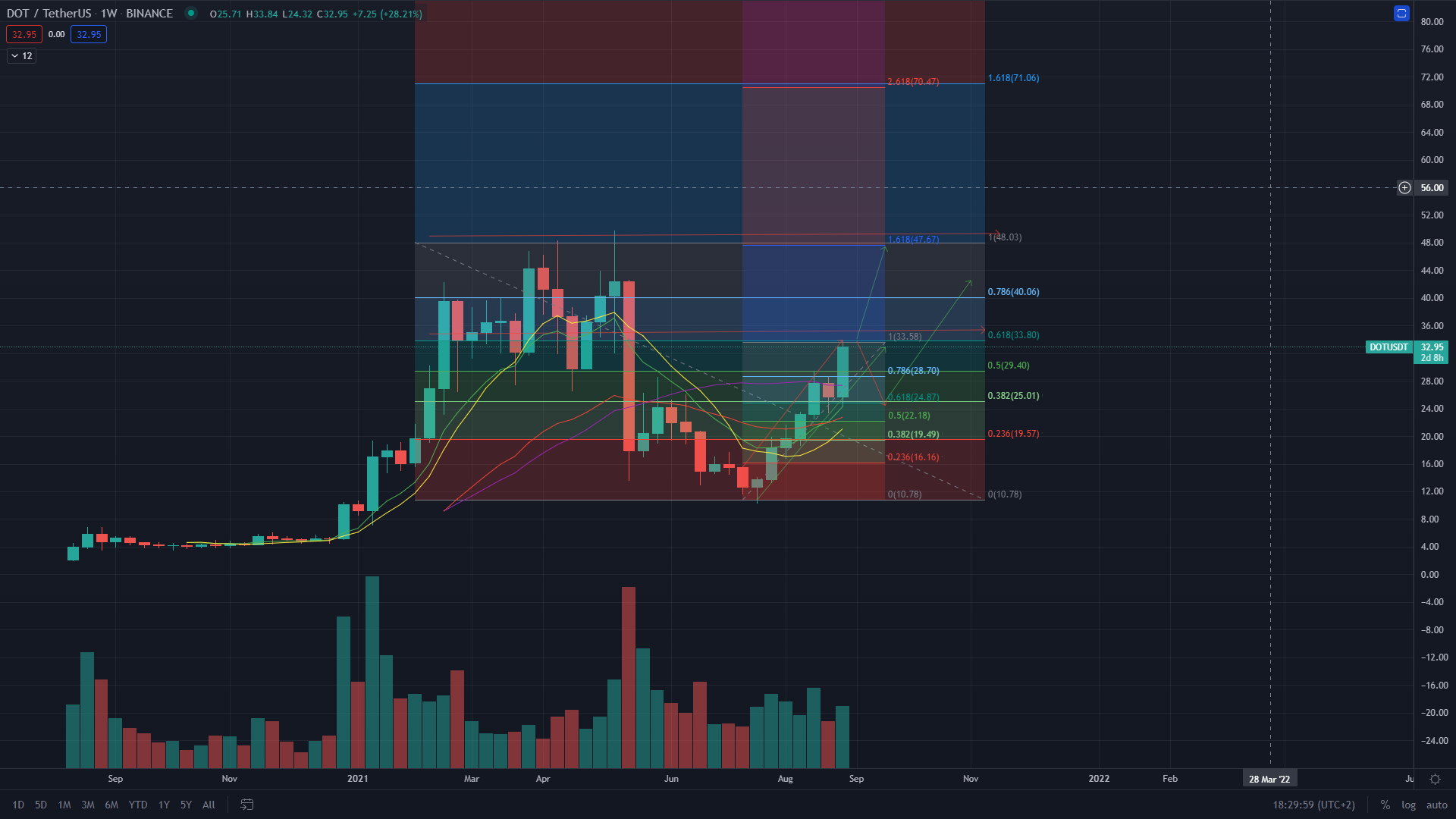 Seit dem Tiefpunkt vom 20. Juli 2021 (11 USD) hat sich der Polkadot Preis verdreifacht. Momentan befindet sich der DOT Preis bei dem 0.618-Fib-Retracement-Level. Sollte der Wochenschlusskurs über dem Level liegen bzw. der DOT Kurs das Level als Support validieren, dann wird sich der DOT Kurs im September wahrscheinlich dem letzten Allzeithoch (49.46 US-Dollar) nähern. Der langfristige Trend wäre dann wieder bullisch. Falls das nicht passieren sollte, dann wird der DOT Kurs wohl erstmal etwas konsolidieren, bevor die nächste Aufwärtsbewegung einsetzt.