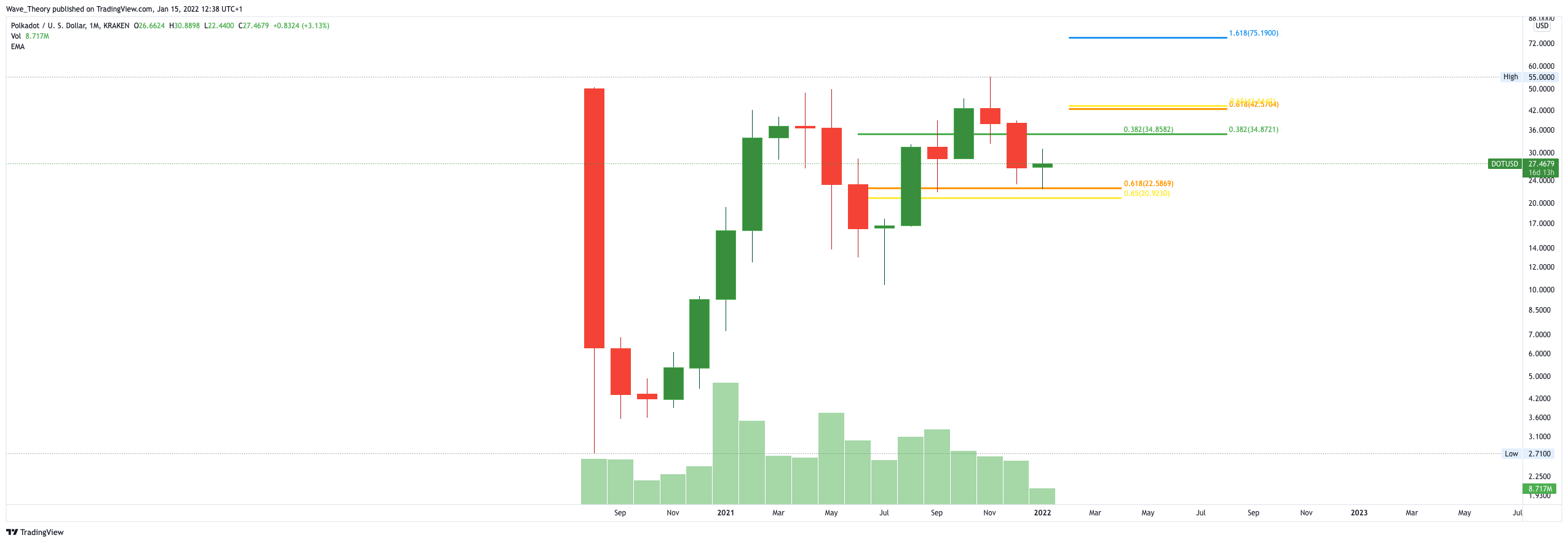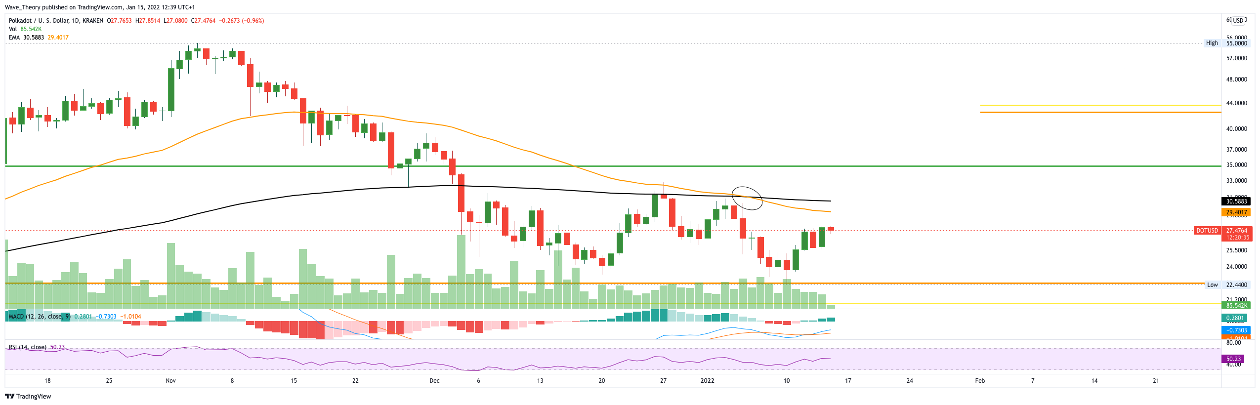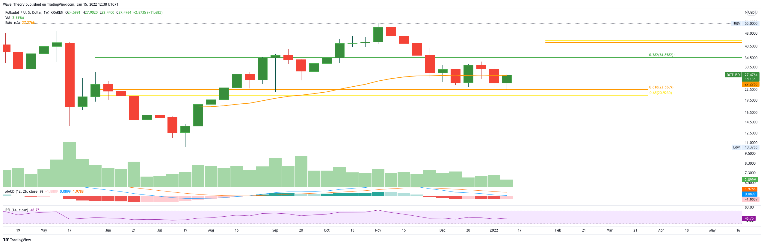 Der Polkadot Kurs erreichte zum Ende letzten Jahres seinen absoluten Höhepunkt bei 55 USD. Seither befindet sich Polkadot in einer Korrekturphase. Die Abwärtsbewegung reichte bis zur Golden Ratio bei rund 22 USD, woran Polkadot sehr stark abprallt.