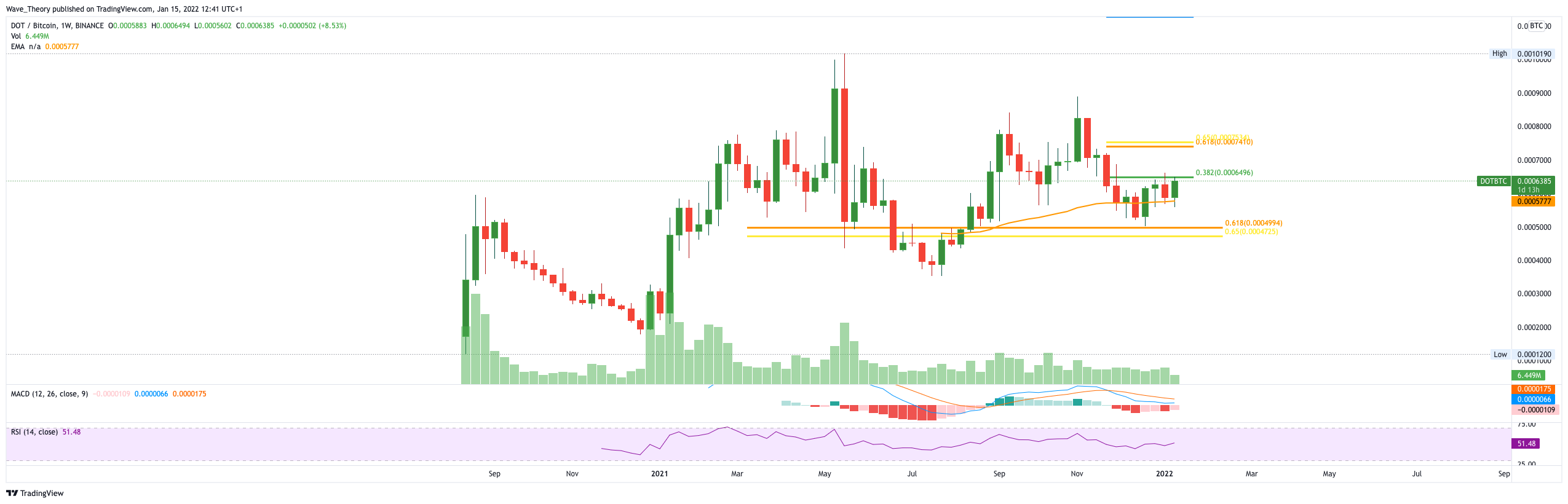 Gegen BTC prallt Polkadot ebenfalls an der Golden Ratio Unterstützung ab. Aktuell stößt der DOT Preis am 0,382 Fib Niveau bei 0,00065 BTC auf Widerstand. Sollte der DOT Kurs diesen Widerstand überwinden, könnte Polkadot sogar bis 0,00075 BTC steigen. Dort stößt Polkadot auf wichtigen Golden Ratio Widerstand. Ansonsten findet Polkadot am 50-Wochen-EMA bei 0,00058 BTC und an der Golden Ratio bei 0,0005 BTC Unterstützung. Auch hier tickt das Histogramm des MACDs bullisch nach oben, was grundsätzlich ein bullisches Zeichen für DOT Preis ist.