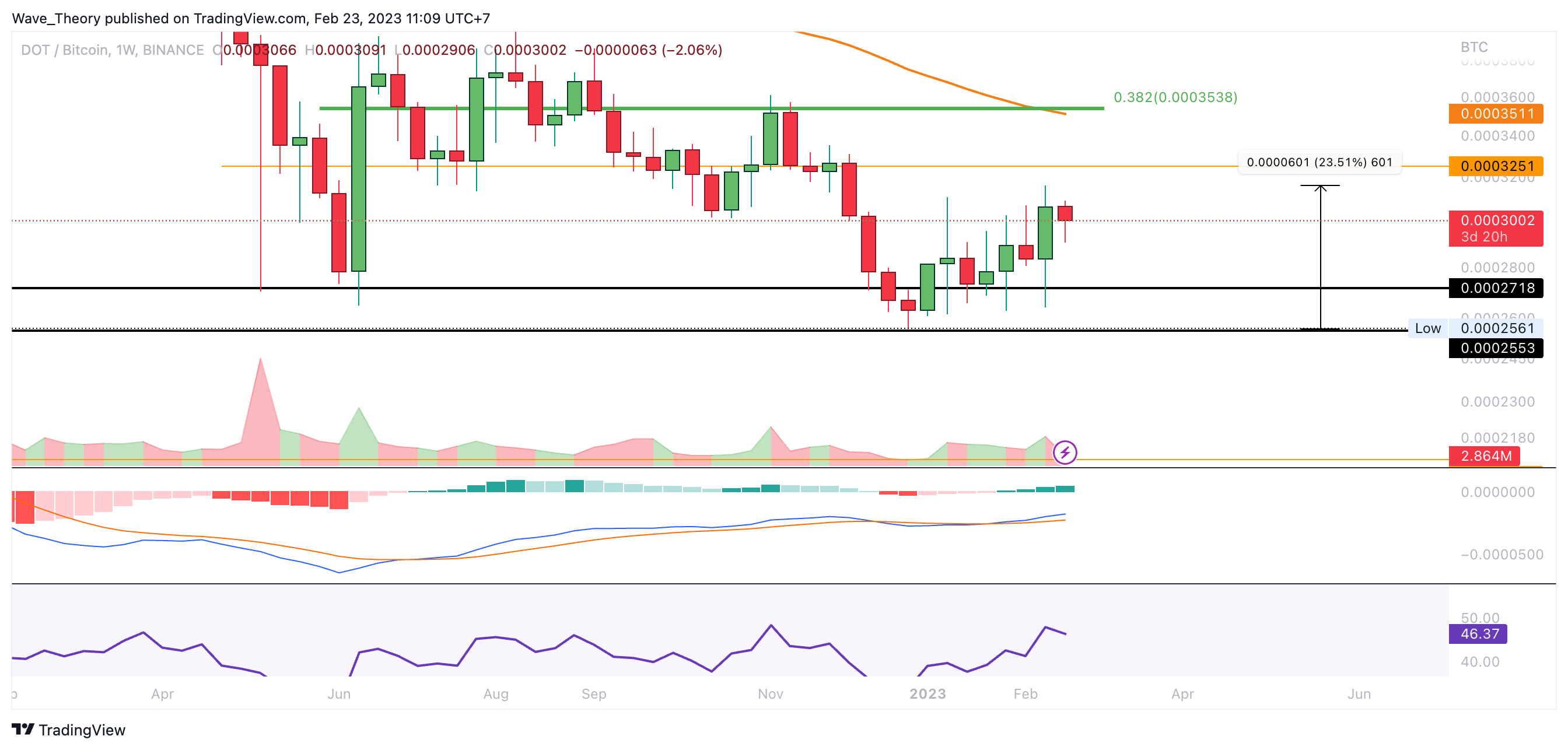Gegen BTC konnte Polkadot bisher an der signifikanten Unterstützungszone zwischen rund 0,000255 BTC und rund 0,000272 BTC abprallen. Insgesamt konnte Polkadot seither rund 23,5 % steigen. Damit wartet bei rund 0,00035 BTC der nächste signifikante Fibonacci Widerstand. Dort fungiert außerdem der 50-Wochen-EMA als zusätzlicher Widerstand.