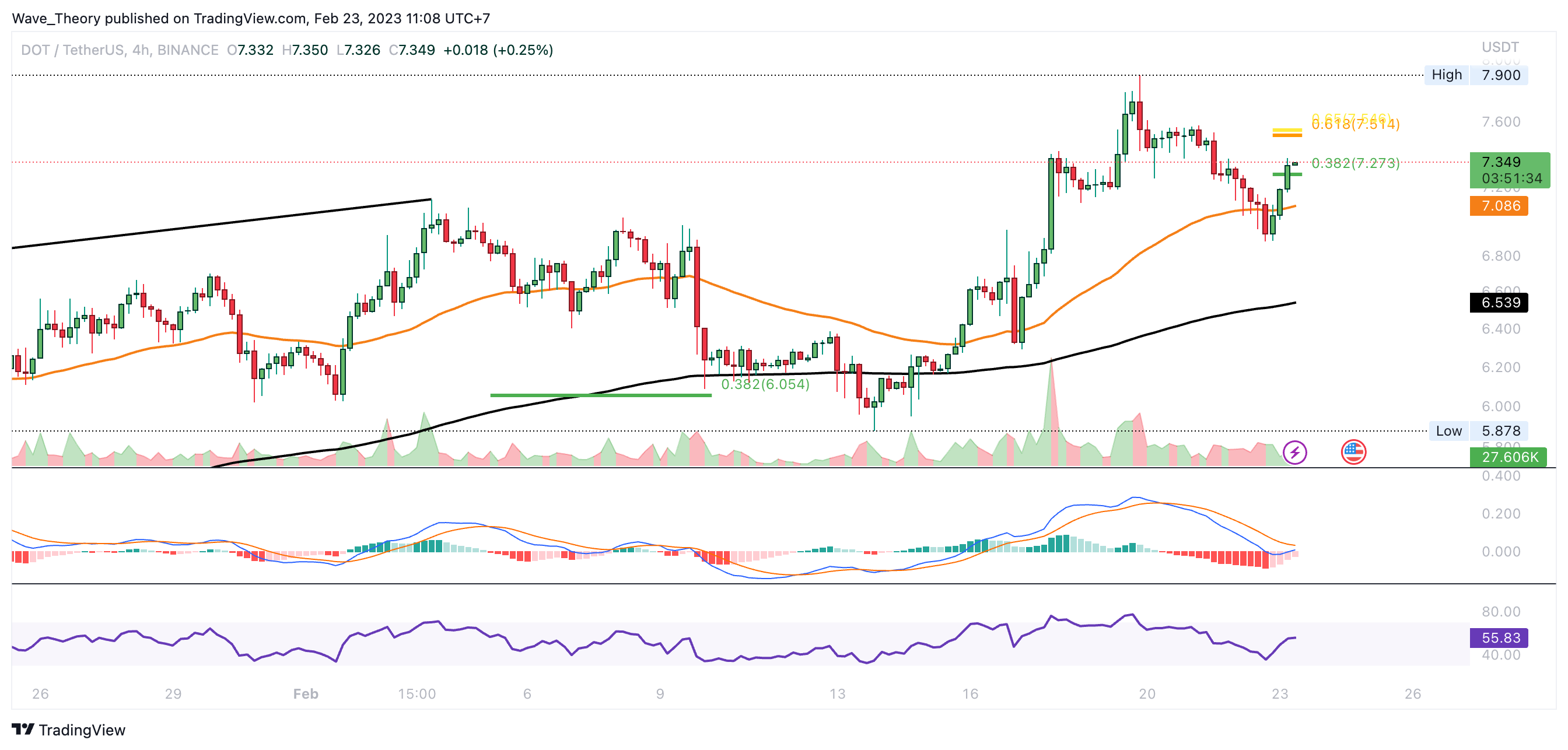 Der DOT Kurs findet jetzt bei rund 6 USD und bei rund 5,25 USD die nächsten signifikanten Fibonacci Unterstützungen. An der 6 USD Marke fungiert zudem der 50-Tage-EMA als zusätzliche Unterstützung.”