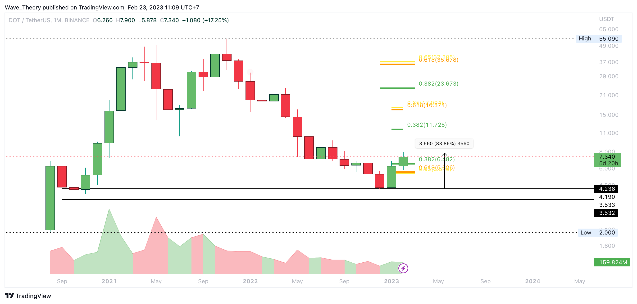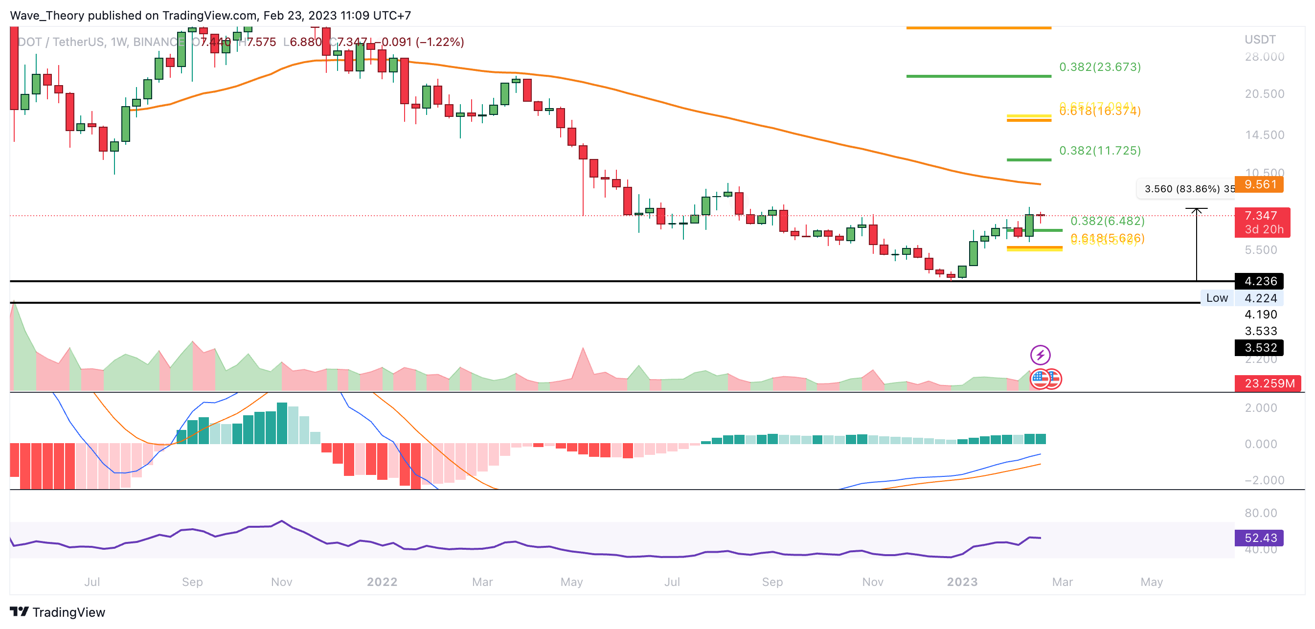Der DOT Kurs konnte seit Beginn des Jahres schon rund 84 % in die Höhe schießen. Damit liegen die nächsten signifikanten Fib Widerstände bei rund 11,725 USD und bei rund 16,5 USD.