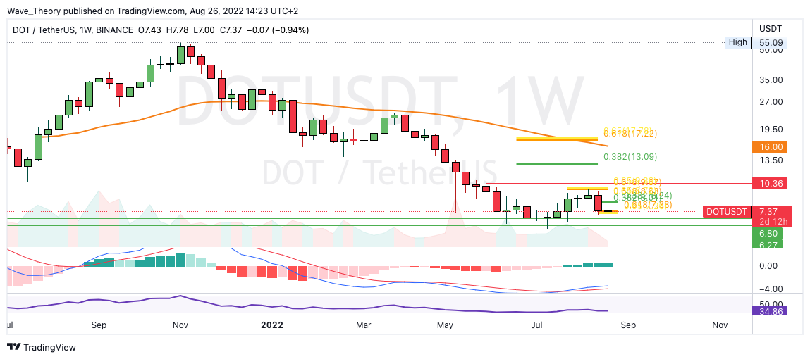 In der letzten Polkadot Kurs Prognose schrieben wir: “Der Polkadot Kurs könnte jetzt auf 7,4 USD korrigieren. Bricht der DOT Kurs die aktuelle Unterstützung zwischen 8,25 und 8,4 USD bärisch, wartet bei rund 7,4 USD die nächste signifikante Fibonacci Unterstützung auf Polkadot. Zwar sieht es kurzfristig nach einer Korrektur aus, jedoch ist der DOT Kurs mittelfristig immer noch stark bullisch.”