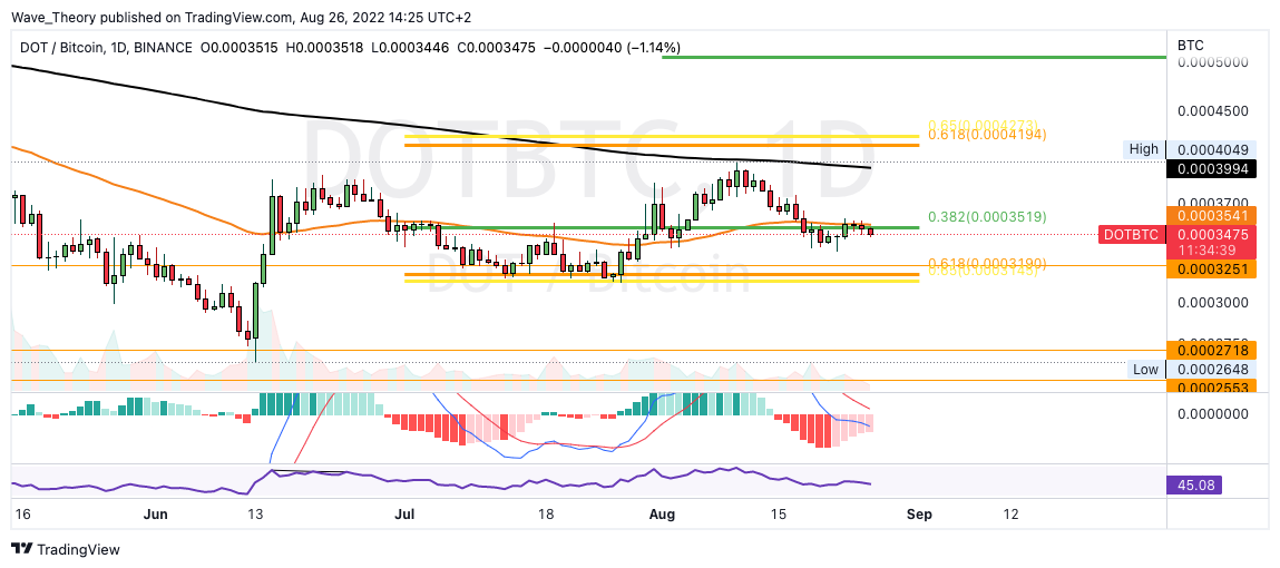 Gegen BTC wurde der Polkadot Kurs am 200-Tage-EMA bei rund 0,0004 BTC bärisch abgewiesen. Aktuell befindet sich der DOT Kurs damit an der 0,382 Fib Unterstützung bei rund 0,00035 BTC und sollte diese bärisch gebrochen werden, findet DOT bei rund 0,000315 BTC die nächste Unterstützung.