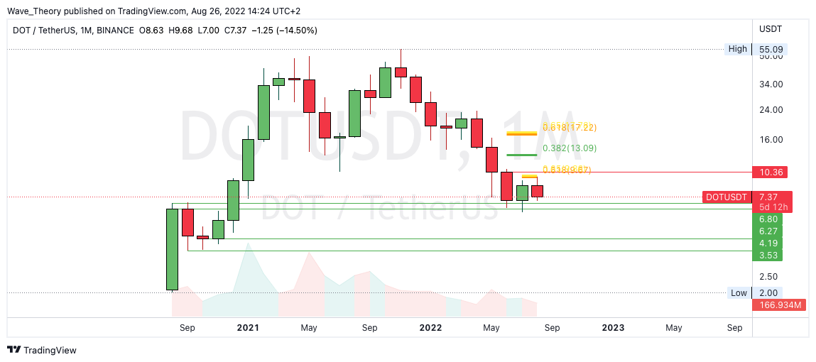 Sollte Polkadot selbst die Unterstützung zwischen 6 USD und 6,8 USD bärisch brechen, wartet erst wieder zwischen 3,5 und 4,2 USD signifikante Unterstützung auf den DOT Kurs.