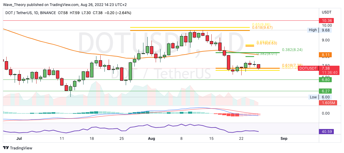 Dort könnte der DOT Kurs jetzt erneut abprallen, um den 0,382 Fib Widerstand bei rund 8 USD zu erreichen. Zudem wartet bei rund 8,11 USD signifikanter Widerstand am 50-Tage-EMA. Des Weiteren muss der DOT Kurs die Golden Ratio bei rund 8,7 USD brechen, um die Korrektur zu beenden.