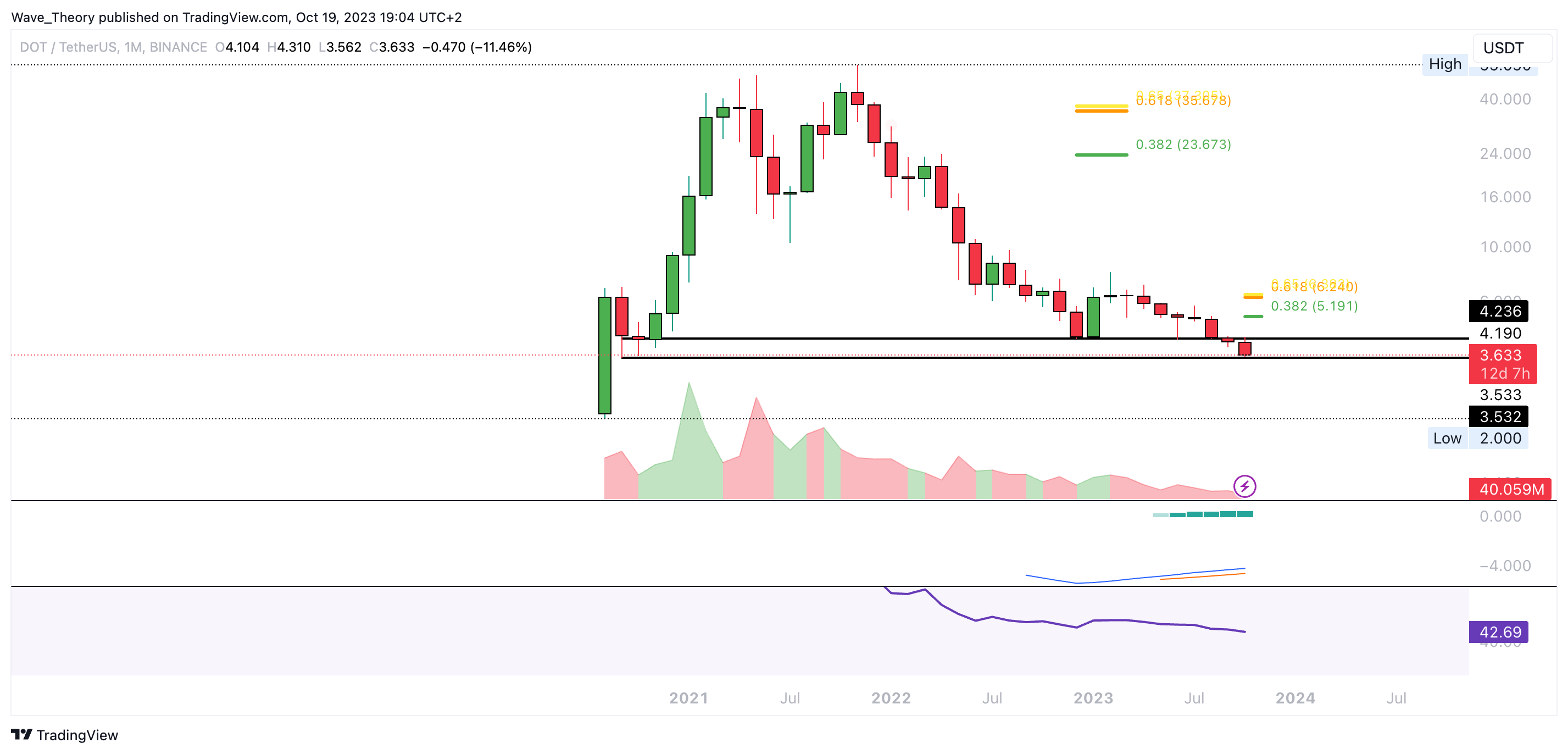 Der DOT Kurs hat das untere Ende der wichtigen Unterstützungszone zwischen rund 3,5 USD und 4,2 USD erreicht. Sollte Polkadot daran jetzt bullisch abprallen, warten bei rund 5,19 USD und 6,25 USD die nächsten signifikanten Fibonacci Widerstände.