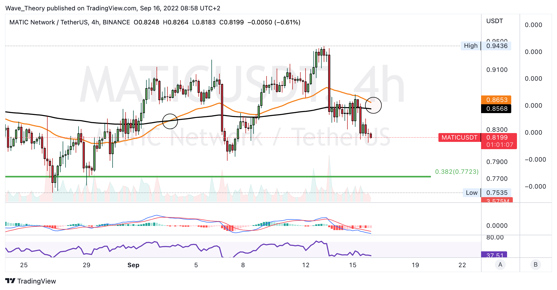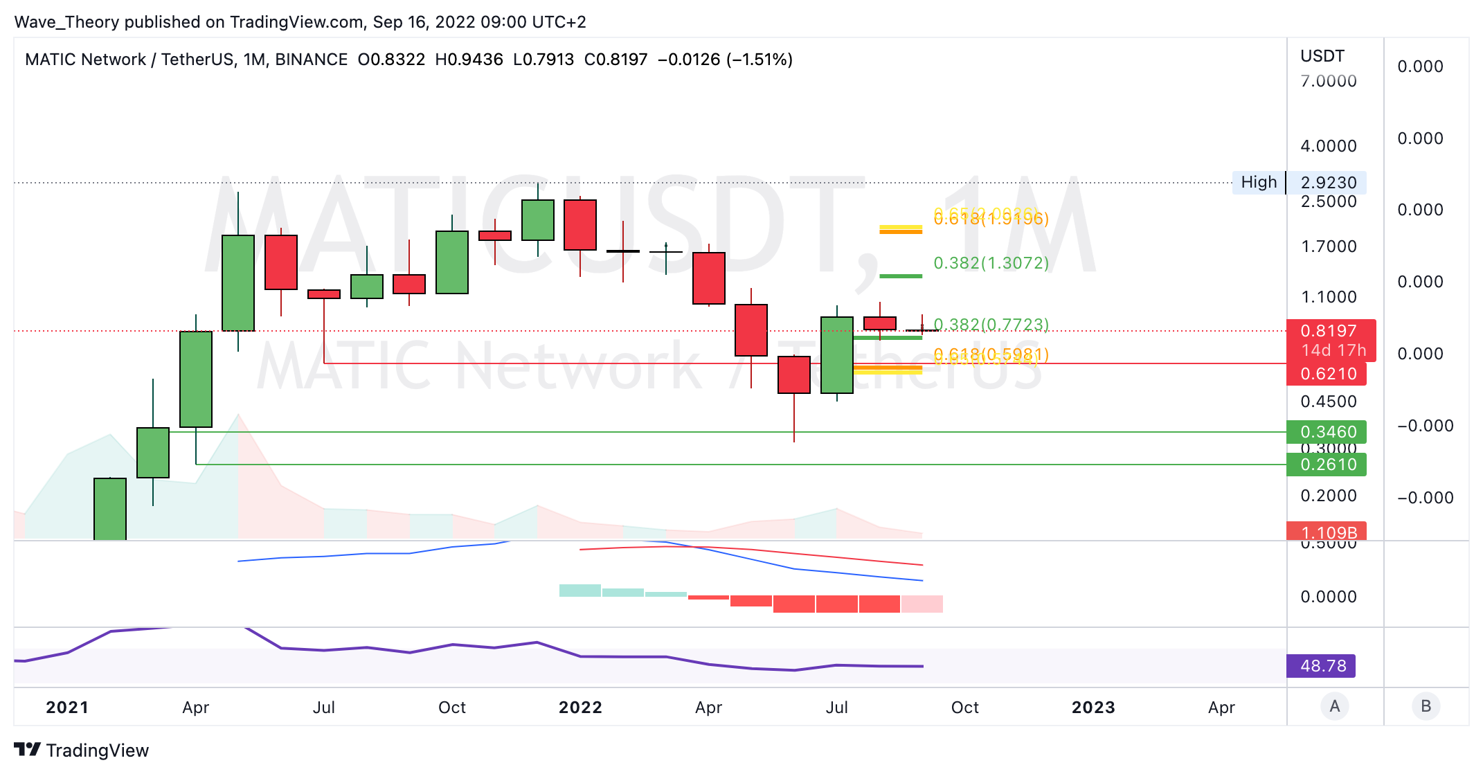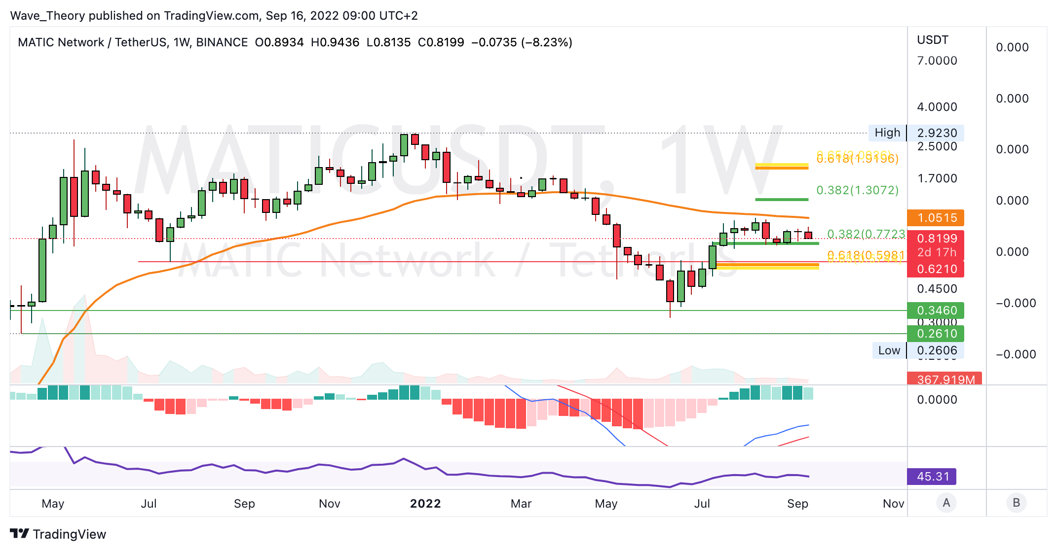 Sollte MATIC an der 0,382 Fib Unterstützung bei rund 0,77 USD nicht bullisch abprallen, sondern diese bärisch brechen, warten bereits bei rund 0,6 USD signifikante Fib Unterstützung auf MATIC.