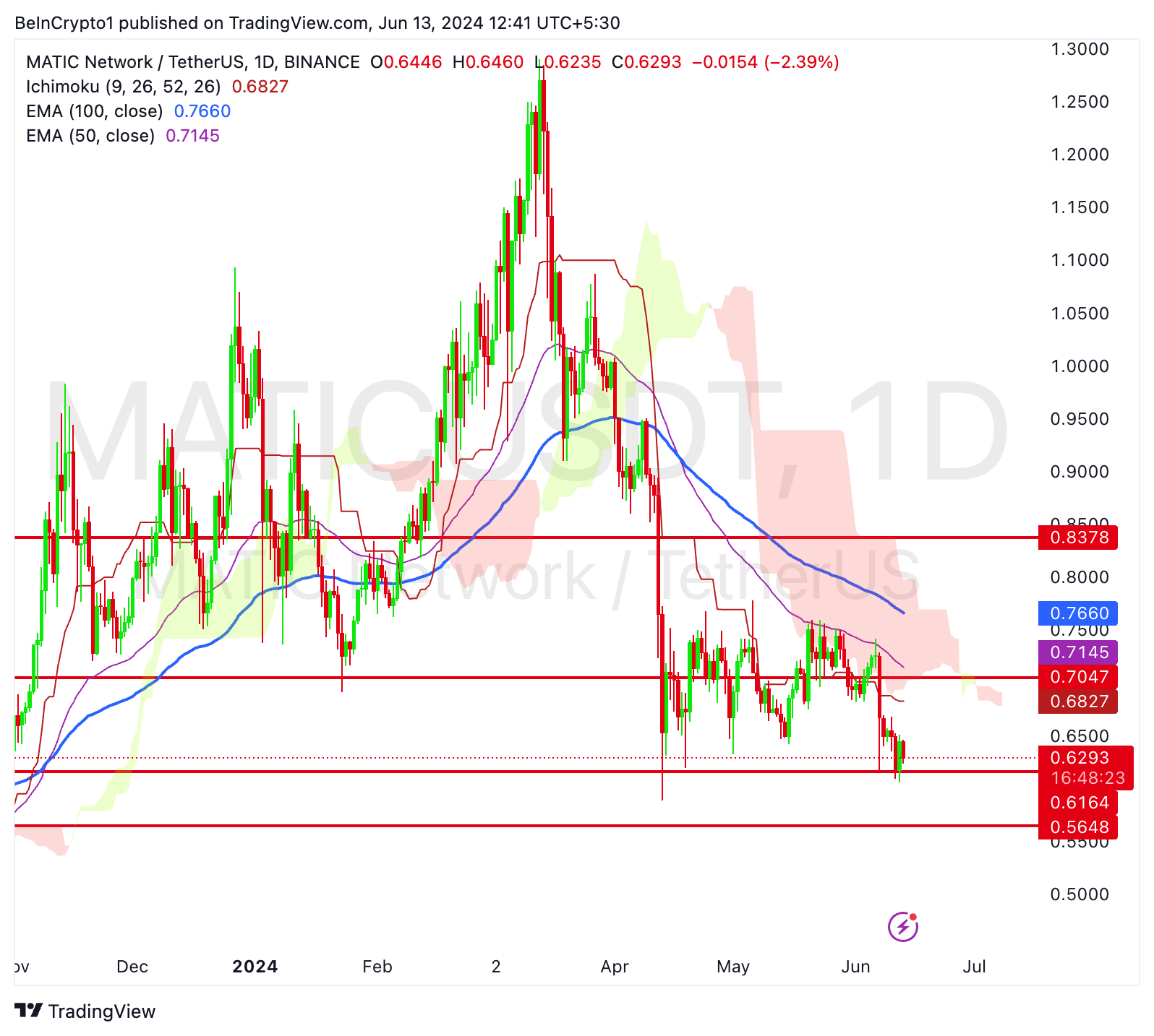 Der Kurs von Polygon (MATIC) hat die Ichimoku-Wolke abgelehnt, was auf eine bärische Stimmung hindeutet, wobei 0,616 USD als wichtige Unterstützung fungieren.