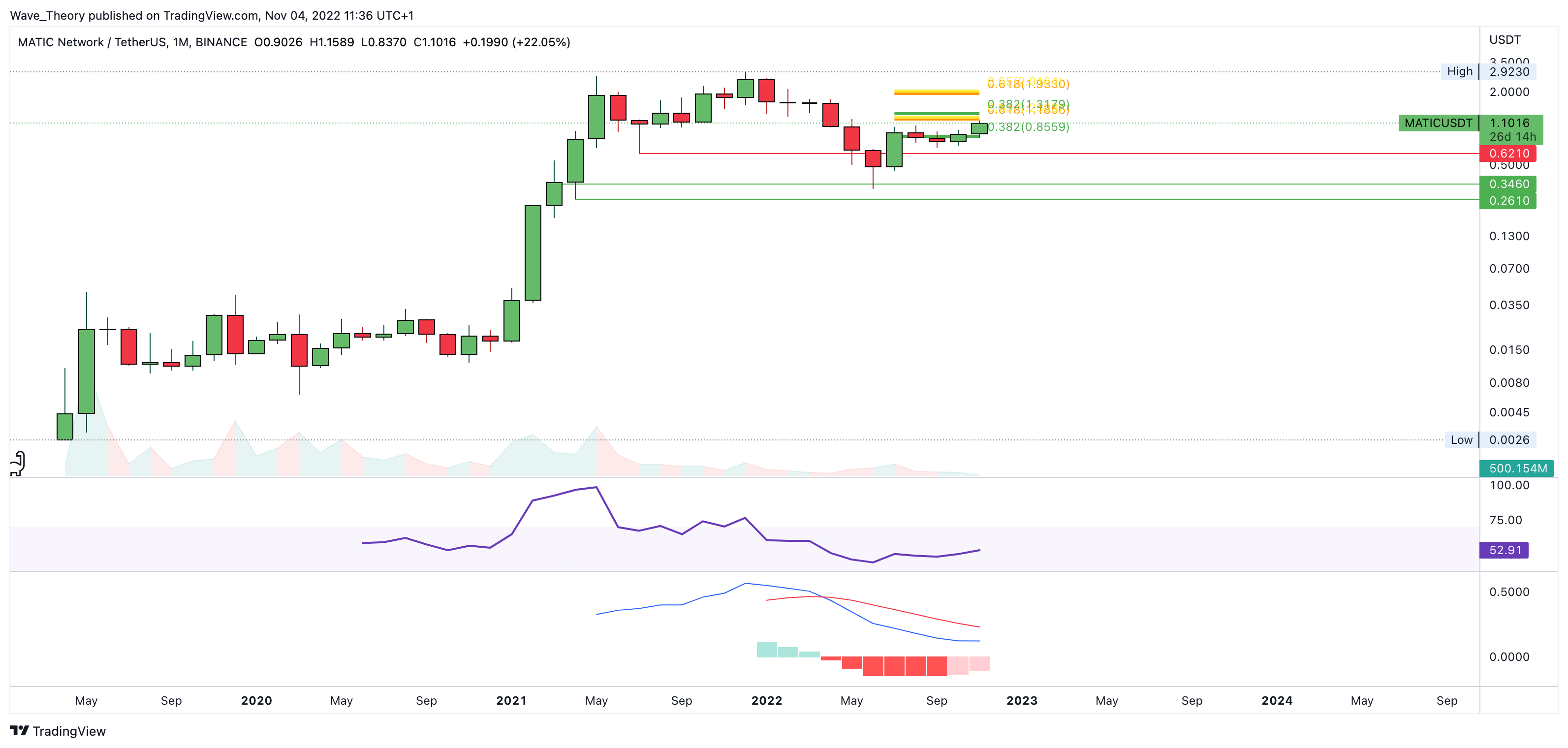 Im Monatschart konnte das Histogramm des MACDs letzten Monat bullisch höher schließen, was ein sehr bullisches Zeichen ist. Sollte MATIC die 2 USD Marke überwinden, befindet sich der Polygon Kurs in einem neuen Bullenzyklus mit Chancen auf ein neues ATH.