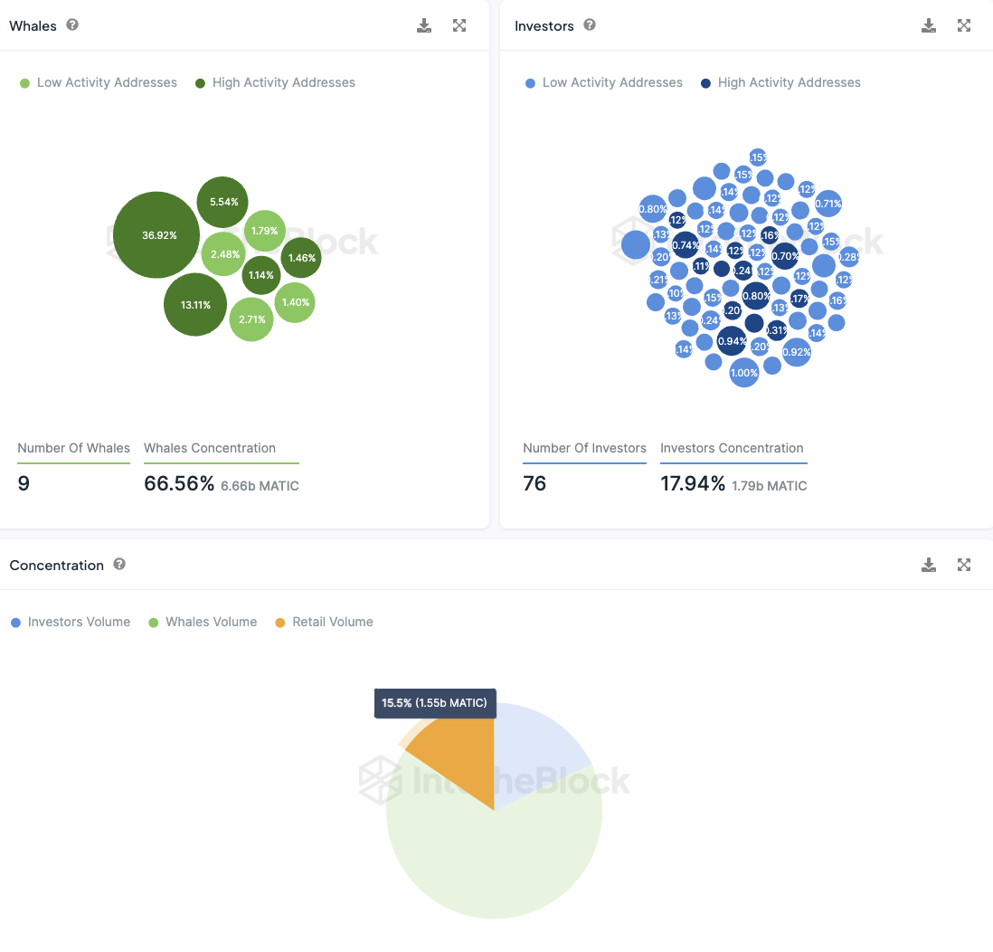 Die Verteilung der MATIC-Token zeigt eine hohe Zentralisierung von Walen. Nur neun Adressen kontrollieren zusammen mehr als zwei Drittel (66,56 %) aller zirkulierenden MATIC-Token, wobei jede dieser Wal-Adressen über 1 % des gesamten Tokenbestands verfügt.