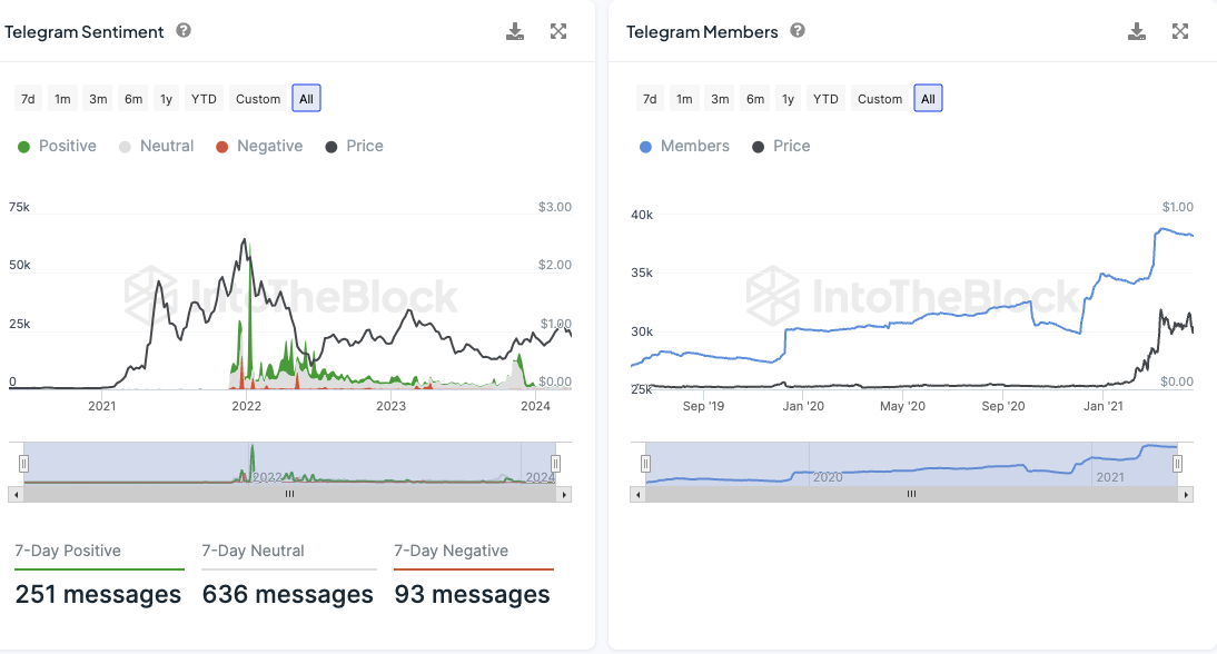 Die meisten (636) Nachrichten bzw. Kommentare wurden dabei als neutral eingetupft. Die Anzahl der Polygon-Telegram-Gruppe weist dabei seit geraumer Zeit einen Abwärtstrend auf. Denn die Anzahl an Telegram Mitgliedern verringert sich seit 2021 beständig.