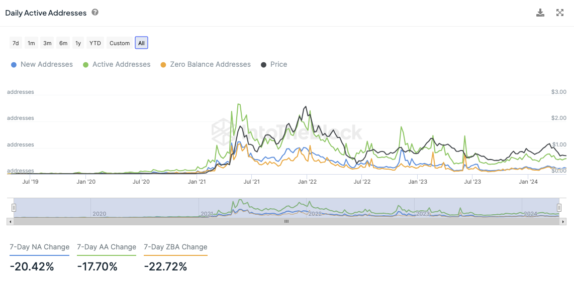 Obwohl das Netzwerk weiterhin ein langsames Wachstum verzeichnet, ist die Netzwerkaktivität in den letzten sieben Tagen wieder stark zurückgegangen.