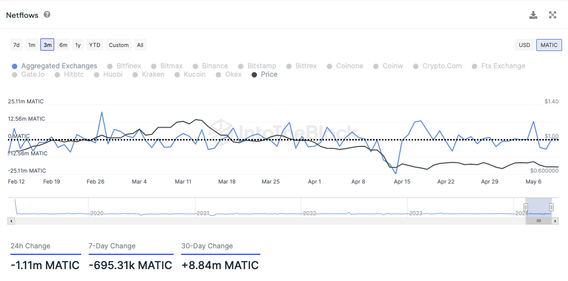 Ein Blick auf die Ein- und Auszahlungsdaten zeigt einen Überschuss an Auszahlungen von Krypto-Börsen in den letzten 24 Stunden sowie im 7-Tage-Trend. In den letzten 30 Tagen liegt jedoch ein Einzahlungsüberschuss von fast 9 Millionen MATIC Token vor.