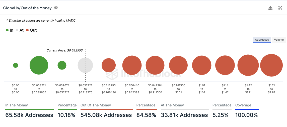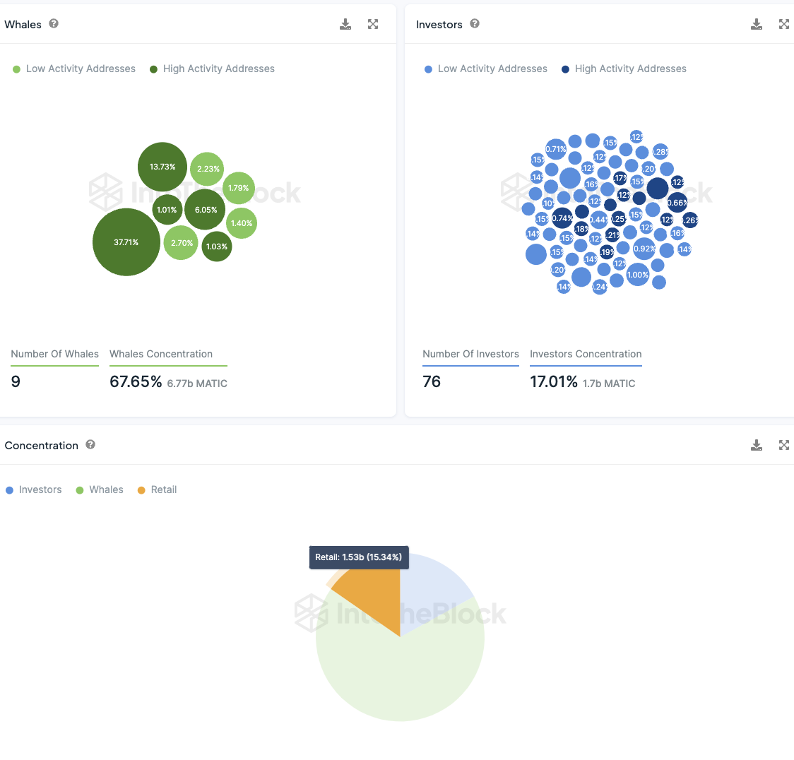 Die jüngsten Daten von IntoTheBlock werfen Licht auf sowohl bärische als auch bullische Trends bei Polygon. Eine bemerkenswerte Tatsache ist die Dominanz von Großwalen im Netzwerk. Neun Adressen kontrollieren zusammen mehr als zwei Drittel aller zirkulierenden MATIC Token, wobei jede dieser Adressen über 1 % des gesamten Tokenbestands verfügt.