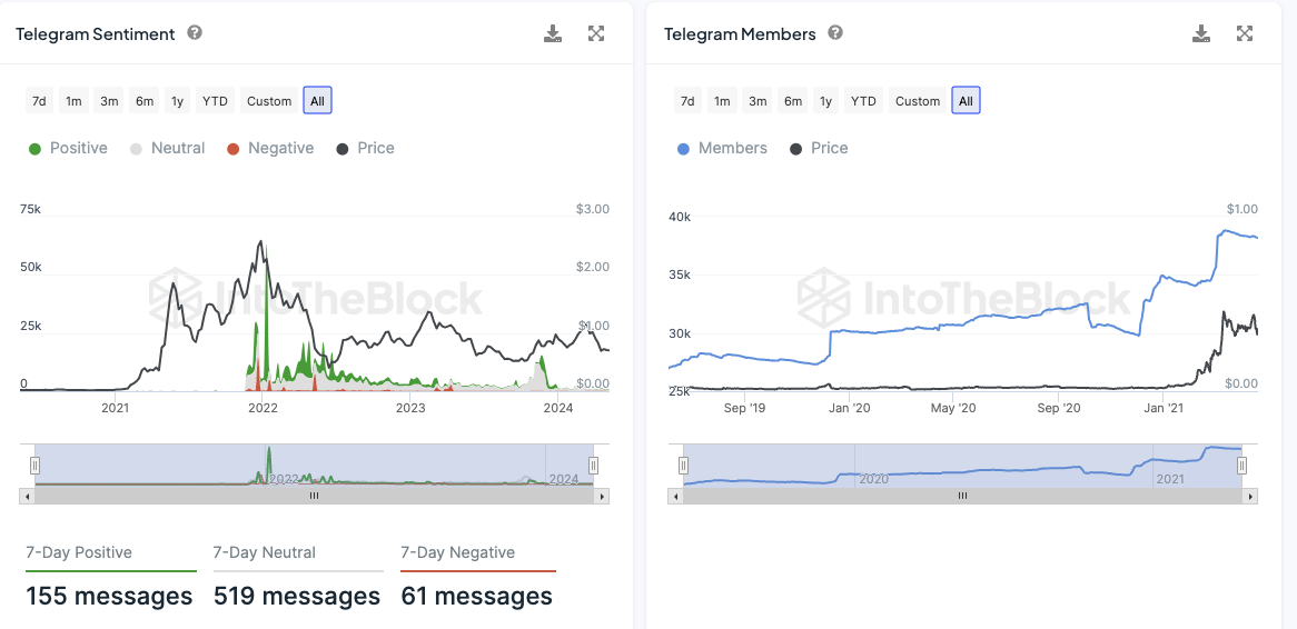 Die Stimmung gegenüber Polygon bleibt jedoch auf Telegram größtenteils positiv, obwohl die Anzahl der Mitglieder in den Telegram-Gruppe seit 2021 stetig abnimmt.