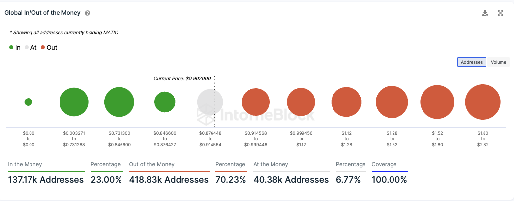 Derzeit sind über 70 % der Polygon Adressen im Minus. Lediglich 23 % der Polygon-Adressen können zum aktuellen Kurs mit Gewinn verkaufen.