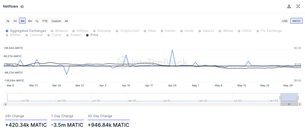 In den letzten sieben Tagen konnte hingegen ein Überschuss von 3,5 Millionen MATIC beobachtet werden, die abgehoben statt eingezahlt wurden. Es ist grundsätzlich eher ein positives Zeichen für den Kursverlauf von MATIC, wenn die Polygon Token von den Börsen abgezogen werden.