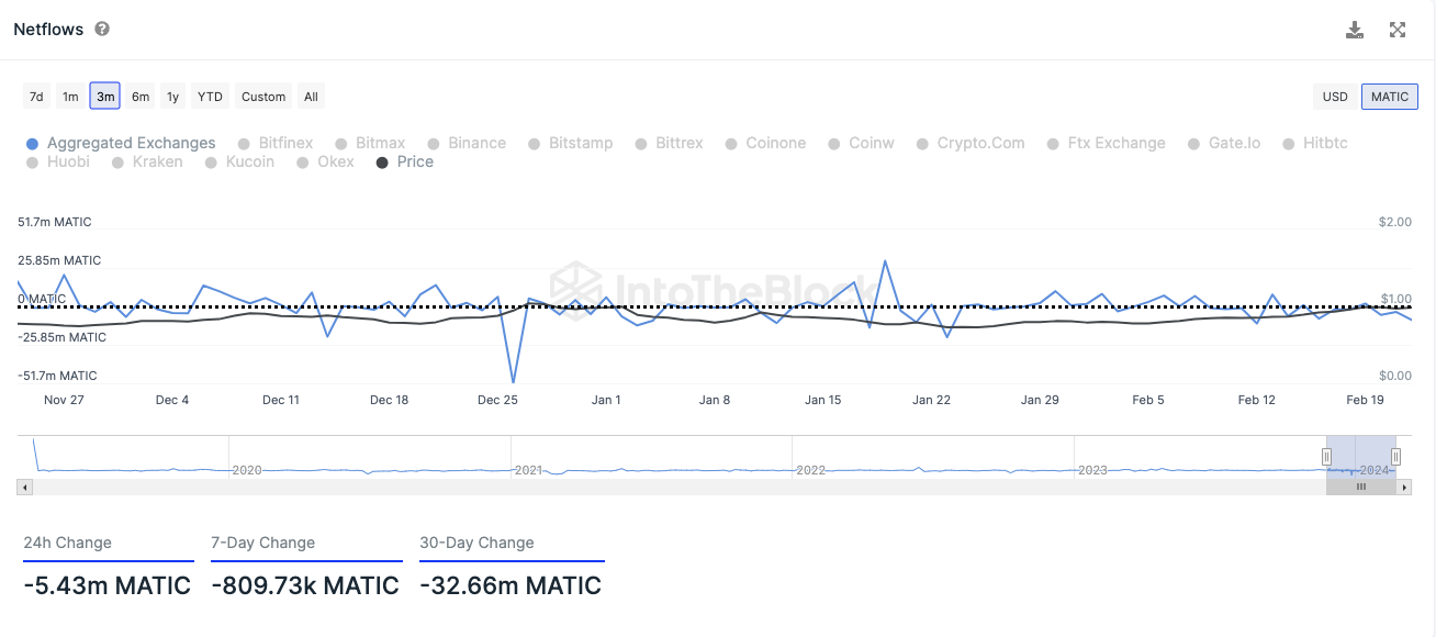 Jenseits des Überschusses an Polygon Abhebungen auf Krypto-Börsen bieten die On-Chain-Daten des Krypto-Tools IntoTheBlock faszinierende Einblicke in die Trends des MATIC Tokens.