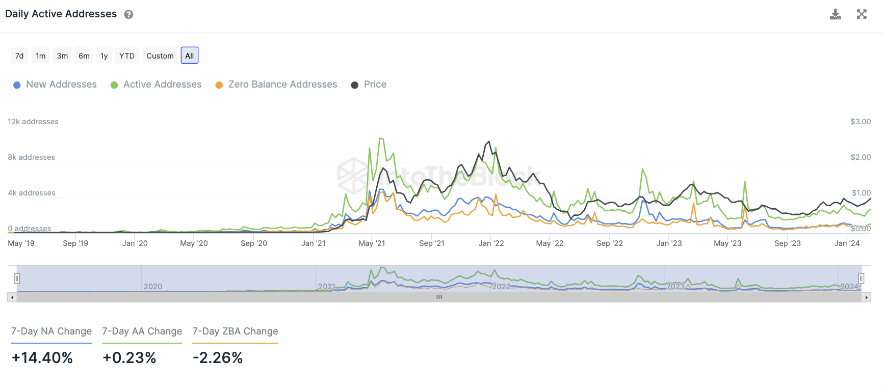 Aktuell sendet die Netzwerkaktivität von Polygon widersprüchliche Signale aus. Innerhalb der letzten Woche verzeichnete das Netzwerk einen Zuwachs neuer Polygon Adressen um etwa 14,4 Prozent. Gleichzeitig erhöhte sich die Zahl der aktiven Adressen um circa 0,23 Prozent, während die Anzahl der Adressen ohne MATIC Bestände um etwa 2,26 Prozent abnahm.