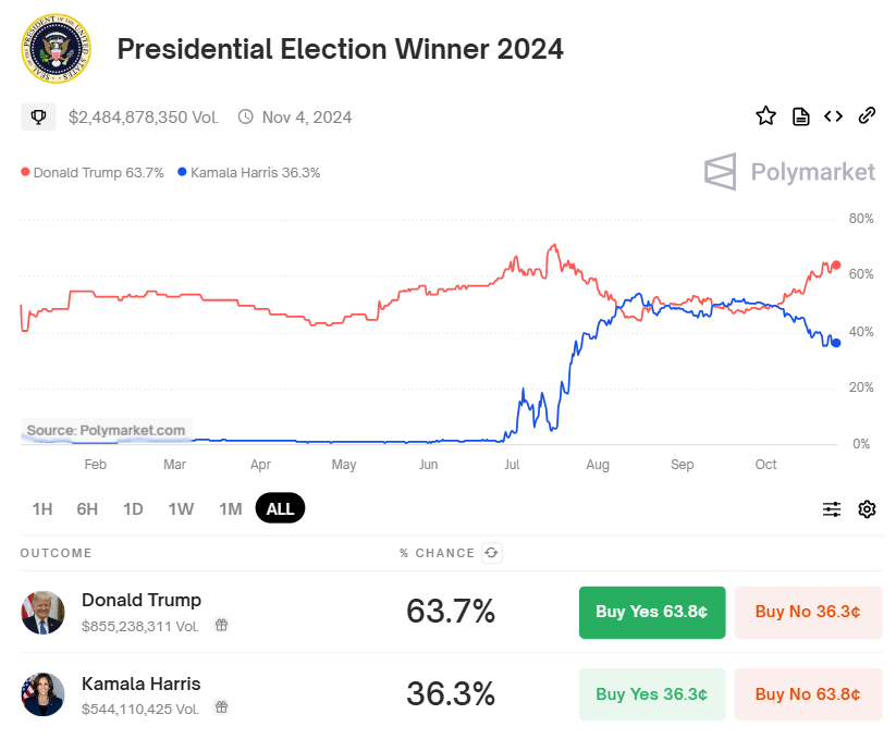 Zum Zeitpunkt der Veröffentlichung zeigten die Daten von Polymarket, dass Trump eine 63,7 Prozent Wahrscheinlichkeit des Sieges hat, während Kamala Harris eine Chance von 36,3 Prozent hält.